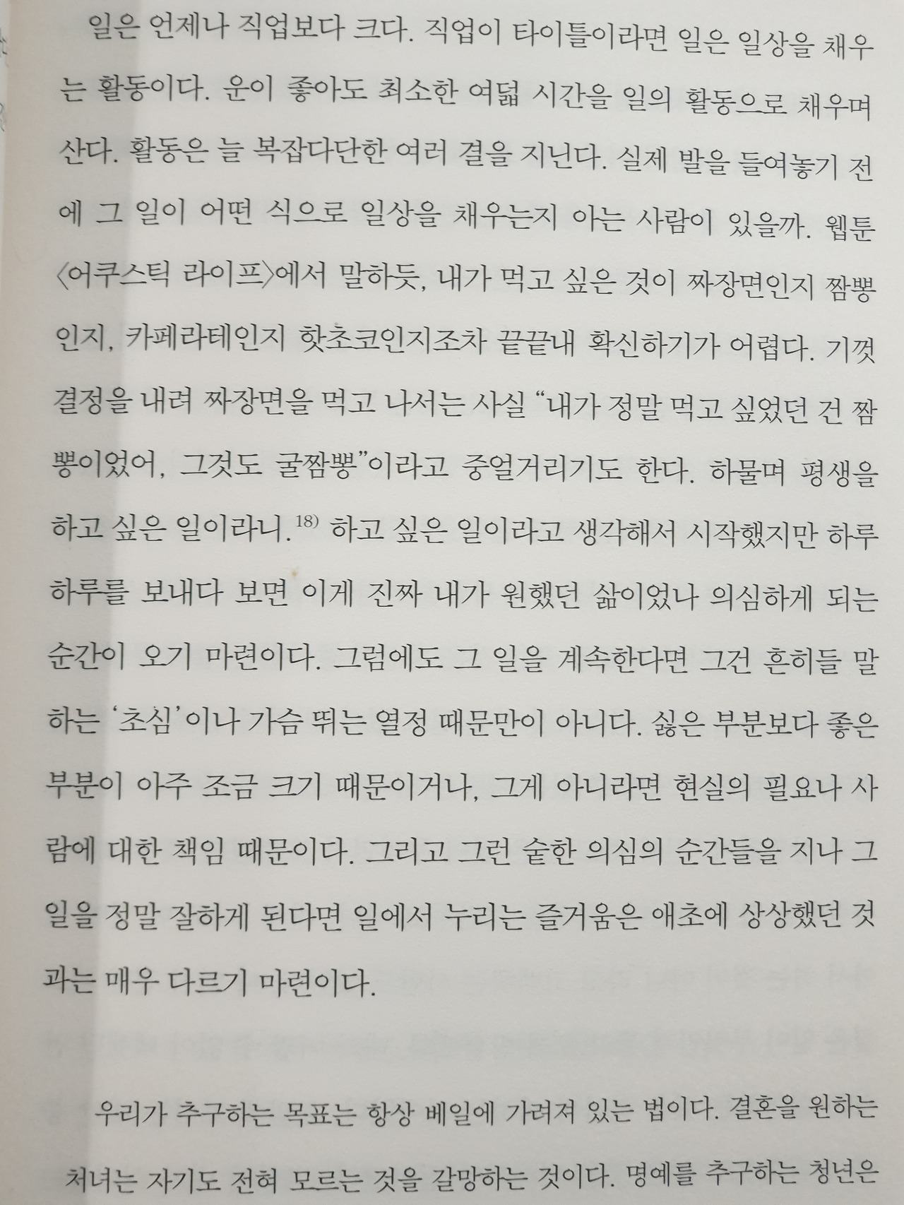 "좋아하는 일을 이상화하며 집착하다 보면 오히려 그 모든 변화를 놓칠 수 있다. 결국 좋아하지 않는 일을 좋아하는 일이라 착각하며 유통기한 끝난 열정을 쏟아붓기도 한다(59쪽)."