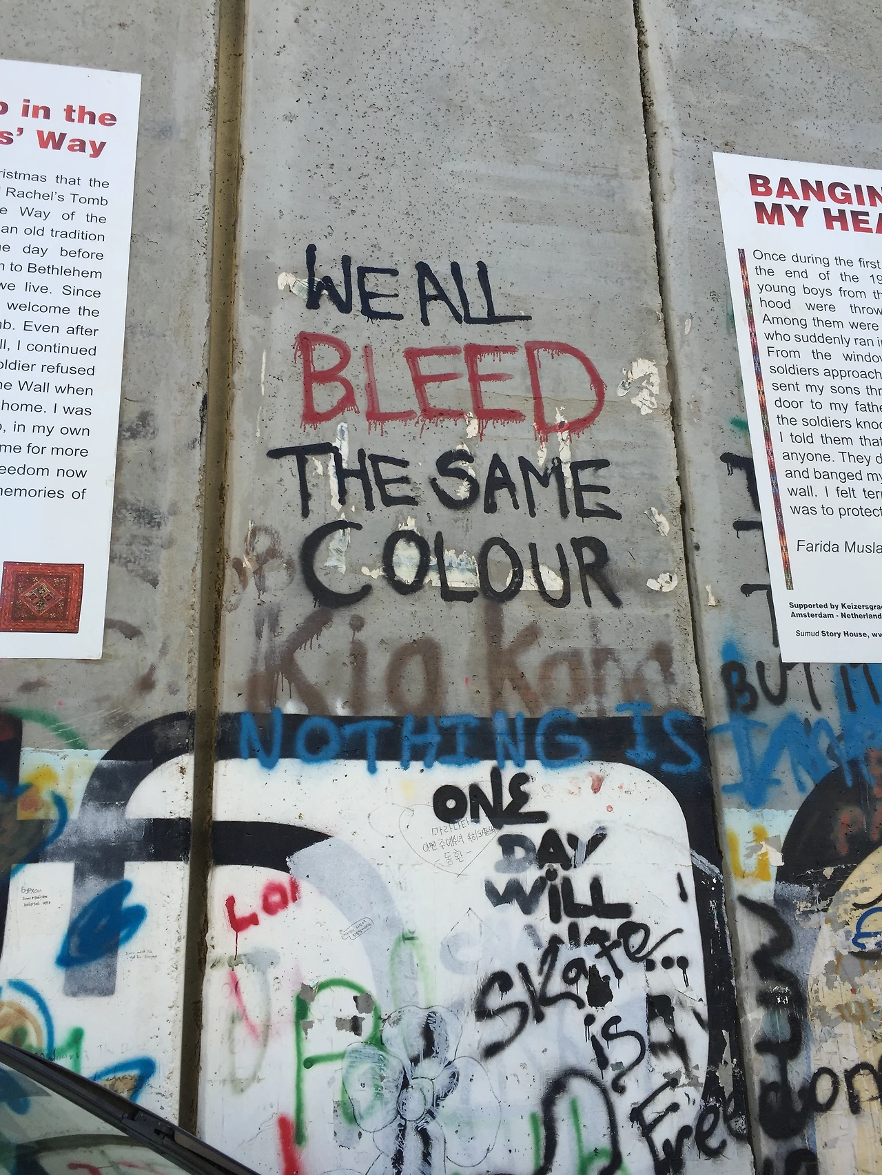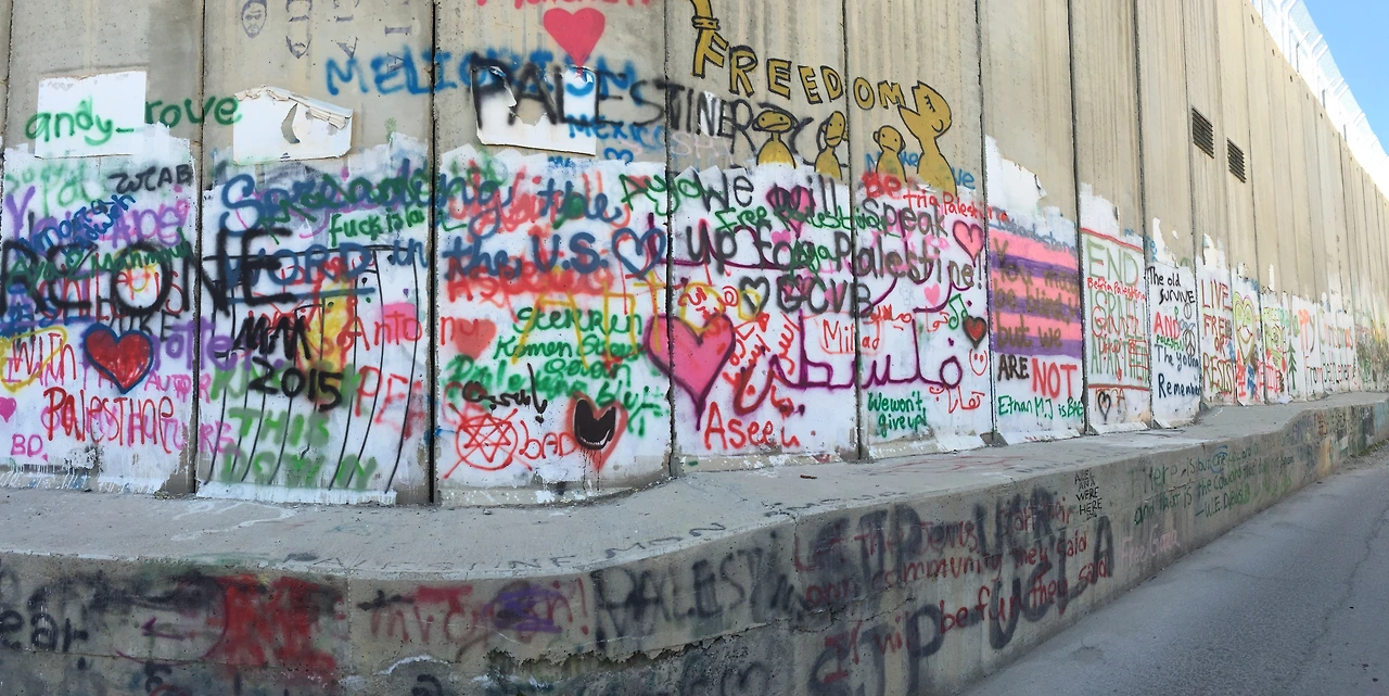 분리장벽 위엔 이를 철거하라고 촉구하는 그림이 가득 그려져 있었고 장벽 때문에 삶의 소중한 것을 잃어버린 팔레스타인인의 이야기도 적혀 있었다.