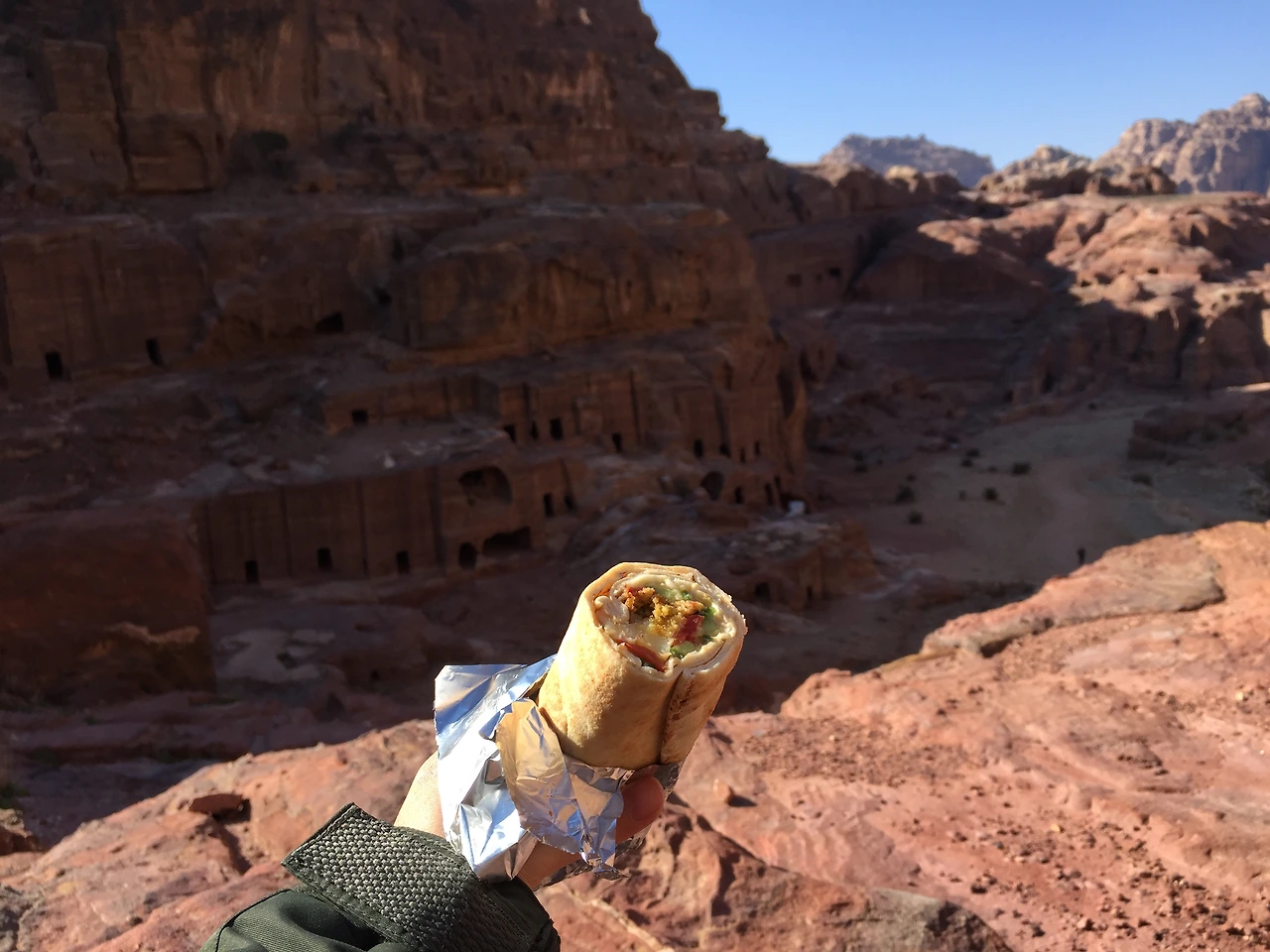 어차피 요르단에서 더 할 일도 없겠다, 우리는 그 호객행위의 늪에 또 한 번 들어가기로 결심했다. 아빠는 주스와 파운드케익을, 나는 아랍 팔라펠 큰 것을 2.5디나르 주고 포장해서 페트라로 향했다.