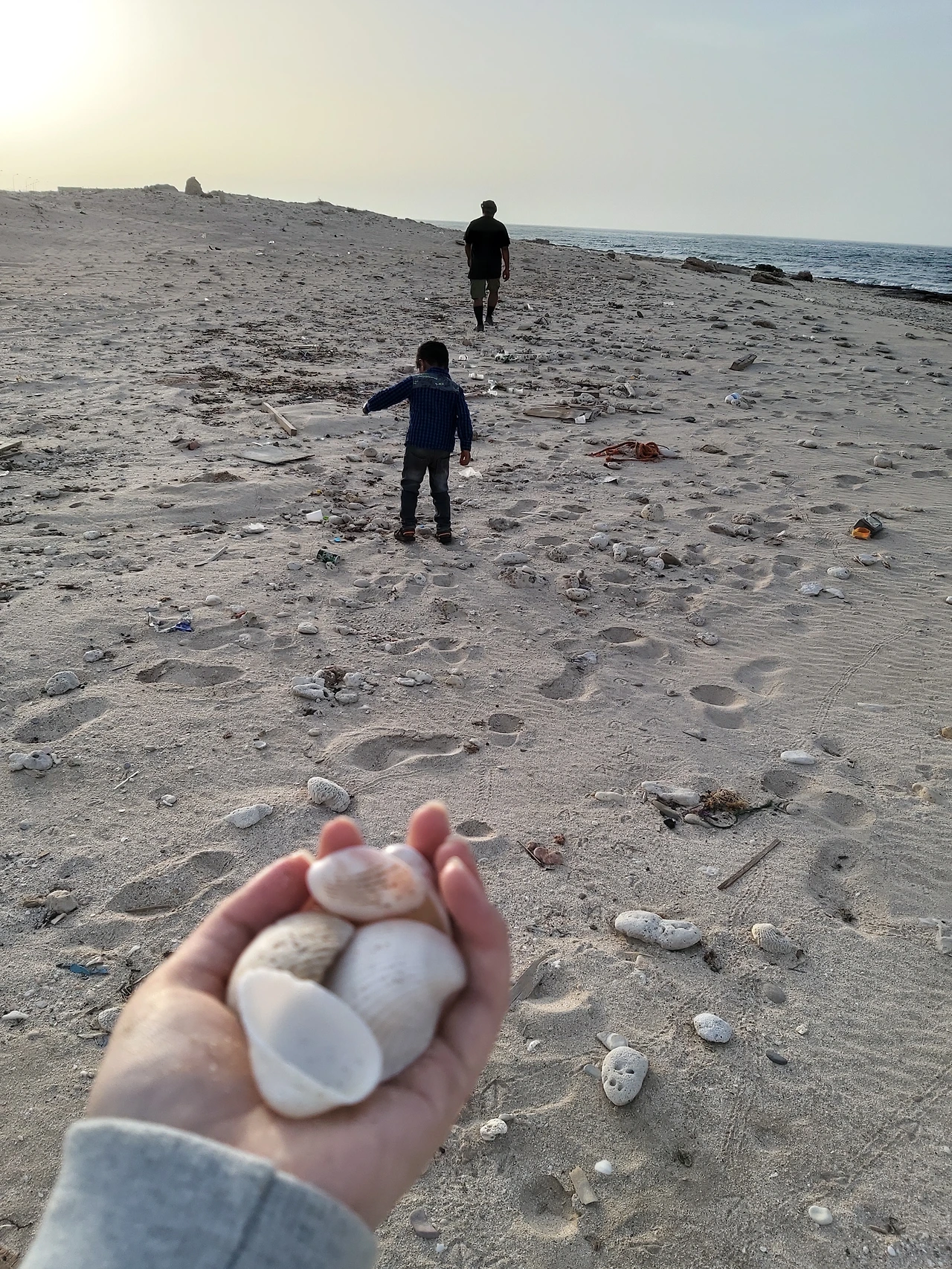 다행히 아흐메드는 좋은 사람이었다. 오만에서 가이드로도 활동한다는 아흐메드는 중간중간 차를 세워 배 만드는 목공소와 낙타 키우는 막사, 염소 목장 등에 데리고 가 줬고 그의 아들은 바닷가에서 주운 조개껍질을 한움큼 내 손에 쥐어주었다. 오가는 길에 꿀 섞은 빵과 밀크티를 마시면서 밖을 바라보니 경치가 그만이었다. 100km를 그렇게 내리 달렸다.
