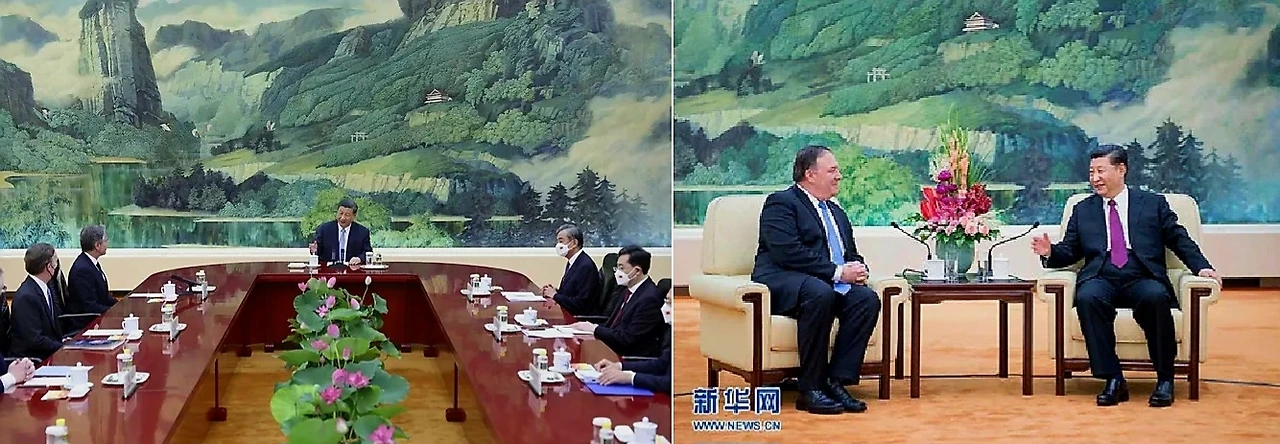 시진핑 중국 주석이 테이블 가운데 상석에 자리했다. 오른쪽엔 중국 외교수장인 왕이 공산당 중앙정치국 위원과 얼마전 온갖 소문을 남긴뒤 소리 소문없이 해임된 친강 전 외교부장이 앉았다. 그 맞은편에서 다소 다소곳한 자세로 시진핑을 바라보는 사람은 토니 블링컨 미국 국무장관이다. 마치 시진핑이 회의를 주재하는 듯한 모습이 연출됐다.