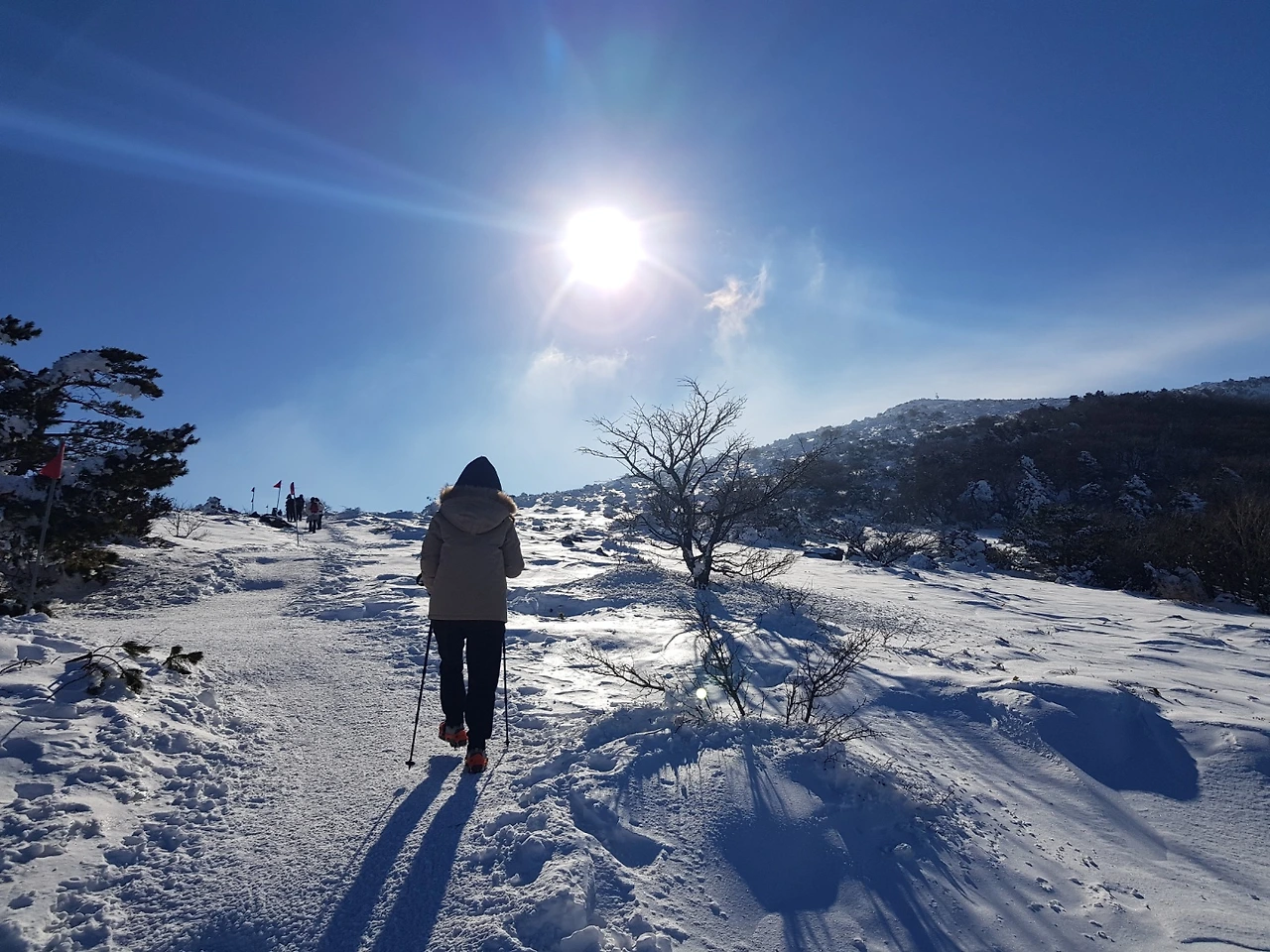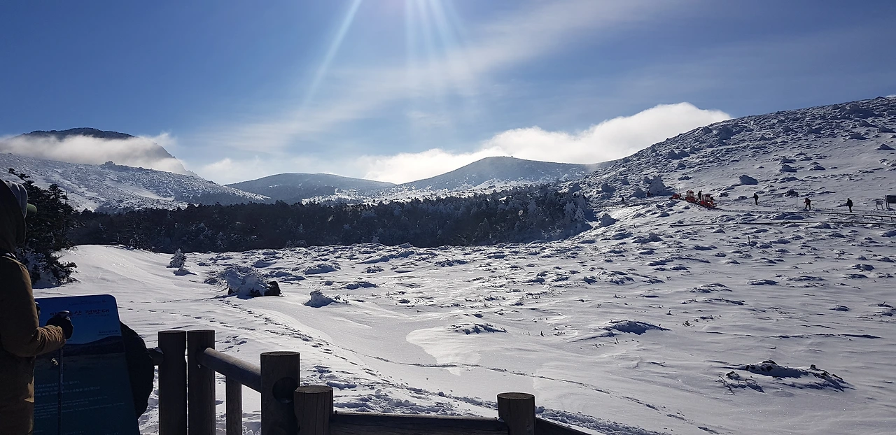 하지만 이곳은 시작이었다. 계속되는 너른 하얀 설경은 내 상상 이상이었다. 스키장 슬로프가 주는 하얀 느낌과는 다른 풍경이었다. 올라온 길을 뒤돌아보면 내 밑으로 제주시가 보이고 낮은 구름대가 보였으며 위로는 파란 하늘이 보였다. 한라산은 말 그대로 찬연히 빛이 나며 신들이 지상의 인간을 내려다볼 때의 느낌은 이런 느낌일지도 모른다는 생각을 했다.