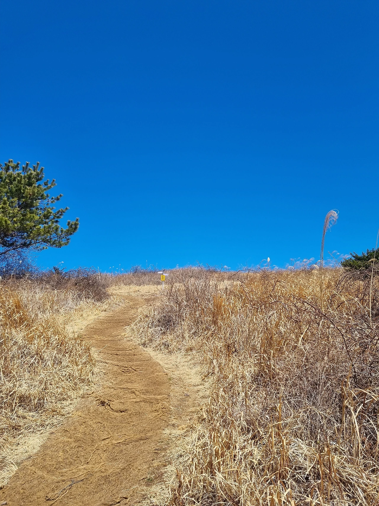 숨이 거칠어지고 손 발이 따뜻해진다 느낄 즈음 어느새 정상이다. 정상에 다다라 고개를 들어 앞을 보니 하늘이 파랗다 못해 시퍼렇다. 분명 올라오기 전만 해도 이렇게 선명하지 않았는데 신기할 정도였다. 누군가 파랗디 파란 색상표 하나를 가위로 오려서 딱 하늘에 붙여놓은 느낌마저 든다.