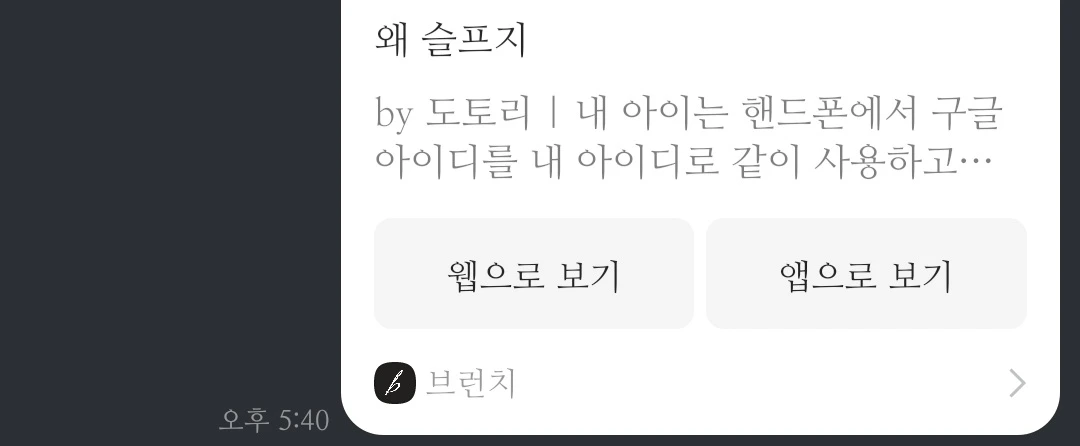 식사를 하던 중 '왜 슬프지'글을 발행했고 아이에게 조용히 브런치 글을 카톡으로 공유해서 보냈다.