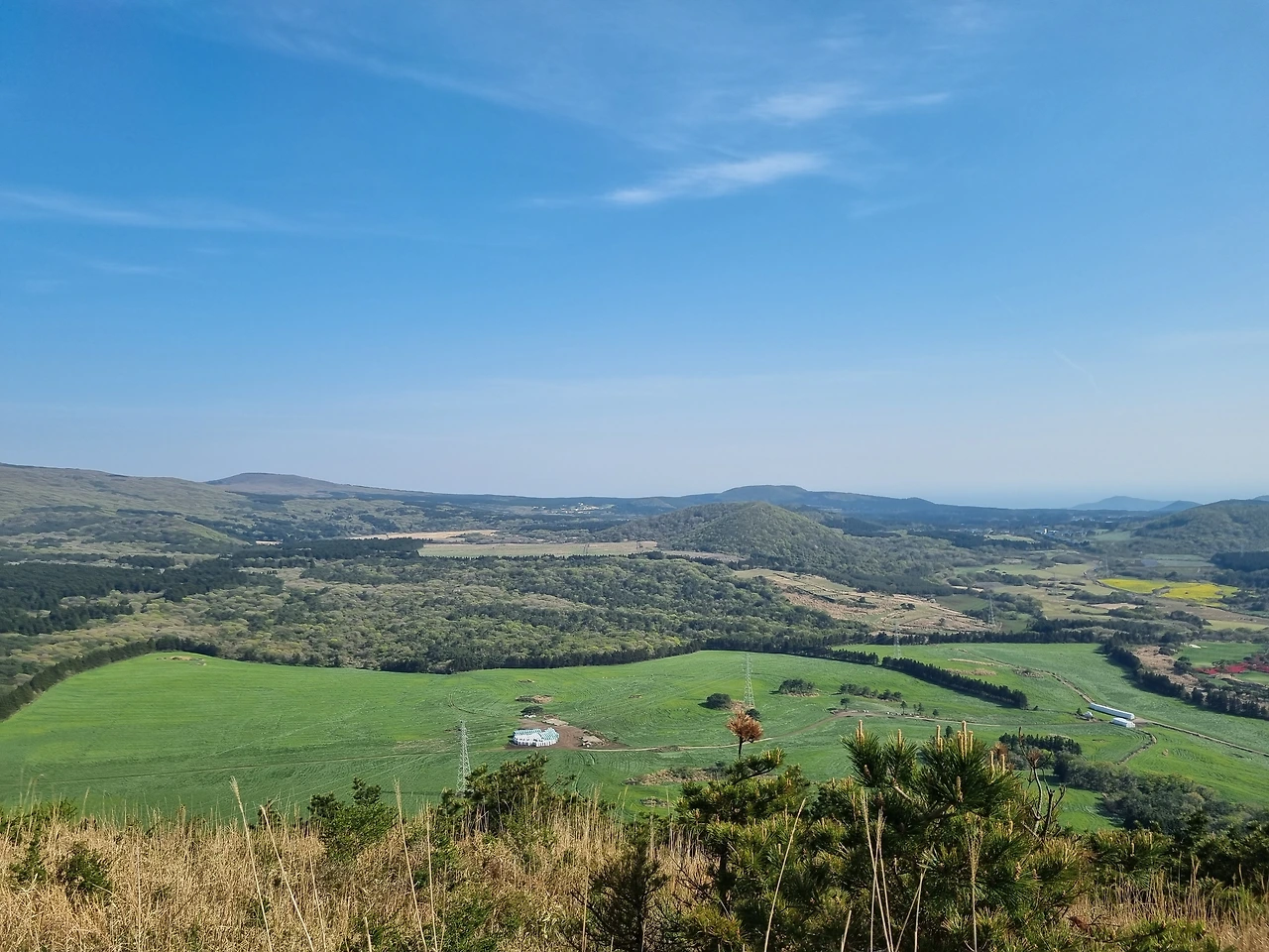 오름 정상에 오르면 막혔던 시야가 뚫려 늘 뭔지 모를 벅참이 가슴에 차오르는데 바리메 오름의 정상은 '우와!' 외마디 감탄사를 여러 차례 내뱉게 된다. 가는 날이 날씨가 좋아서 남동쪽의 한라산과 주변 오름들, 서쪽의 송악산 한림, 애월까지 서쪽 일대가 한눈에 들어왔다. 또 한 번 셀프 360 카메라가 되어 빙그르르 제자리에서 돌아본다. 산 아래 넓고 푸른 초지는 하나의 보너스와도 같았다