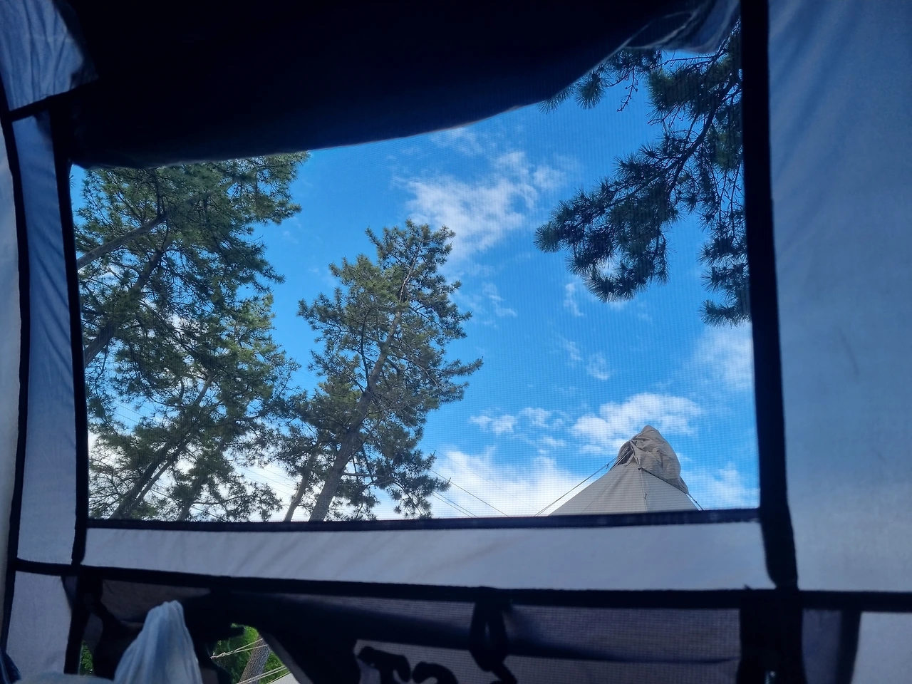 얼마나 지났을까, 새소리에 한 번 잠이 깼는데 이번에는 바람이다. 한 참을 자고 있는데 큰 바람소리가 들리더니 뭔가 후드득 텐트 위로 흩뿌려지는 느낌이다. 고개를 들어보니 나무에서 잎이랑 열매들이 떨어진 것이었다. 바람이 한 번 더 불어 텐트 안으로 기분 좋은 바람이 훅 들어온다. 침낭 위로 빼꼼 내민 얼굴에만 바람이 시원하게 느껴진다. 나도 모르게 눈을 떠 텐트 창으로 비친 하늘을 올려다본다. 나무의 움직임이 느껴지며 날씨를 보게 된다.