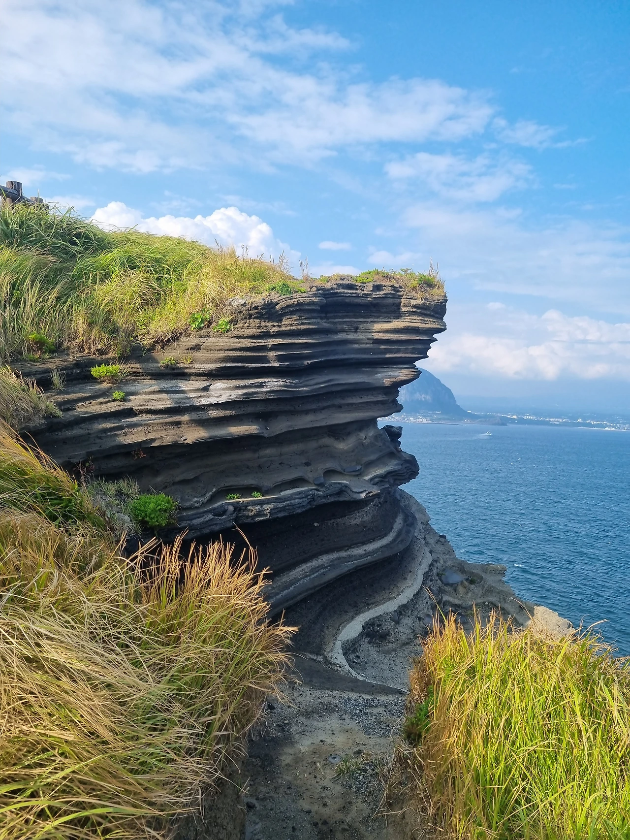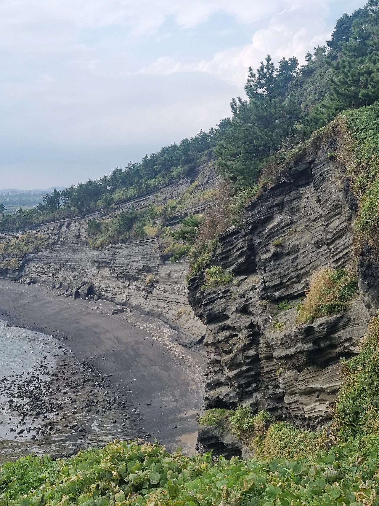 날이 좋아서 저 멀리 가파도와 마라도가 차례대로 눈에 들어왔고 사람들이 앉아서 쉬는 전망대 옆 불안해 보이는 송이로 된 절벽이 눈에 띈다. 조금만 힘이 가해지면 툭 하고 어쩐지 무너져 내릴 것 같다. '저런 절벽이 여기 있었구나.' 한참을 그렇게 가다 보니 독특한 지층들이 보인다. 어떻게 저렇게 되었을까 하는 생각이 들며 눈이 간다.