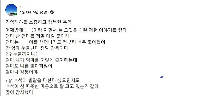그 말에 아이는 자기가 엄마를 이렇게 좋아하는데 엄마도 나를 좋아해 주는 게 감동이라며 눈물이 난다고 했었다. 고작 7살 꼬마가 이런 진지한 말을 하기에 놀라 기록을 해둔 기억이다.