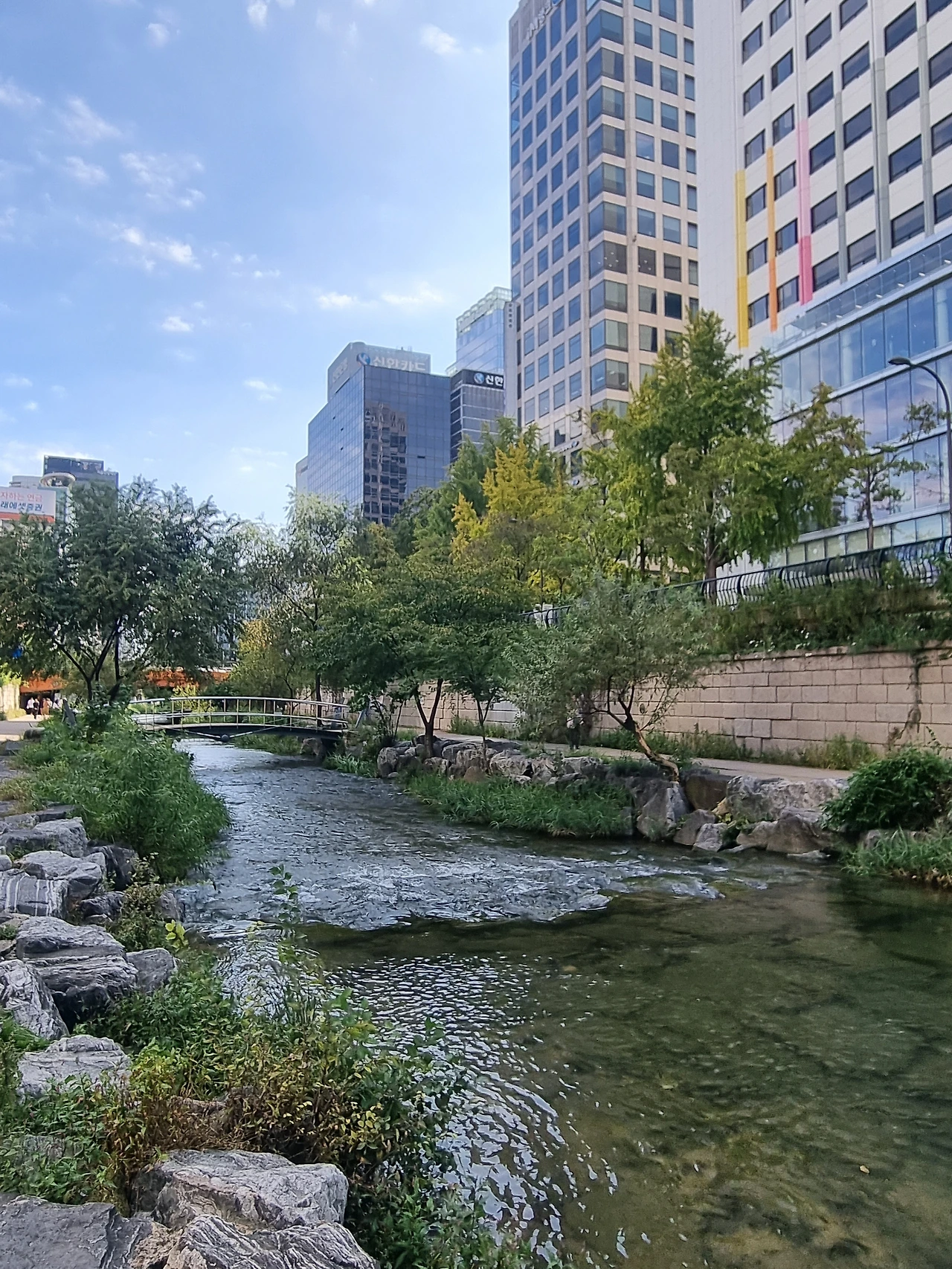 청계천의 흐르는 물을 바라보며 앉아있는데 물 흐르는 소리와 도시의 적당한 소음이 만들어 내는 소리가 한데 섞여 뚜벅이 여행자의 마음에 쉼표를 주었다.