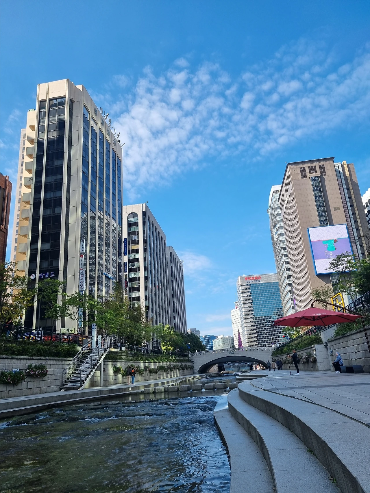 며칠 뒤 다가오는 아이의 생일을 맞아 서울 나들이를 왔다. 아침부터 흐리고 비가 오던 제주 날씨와 달리 서울은 코끝에 서늘하게 느껴지는 공기와 맑고 높은 하늘이 딱 가을이다. 이른 아침부터 서둘러 올라왔던 터라 브런치로 청계천 근처에서 식사를 하려는데 가게 오픈이 30분 남아 청계천 산책을 했다.
