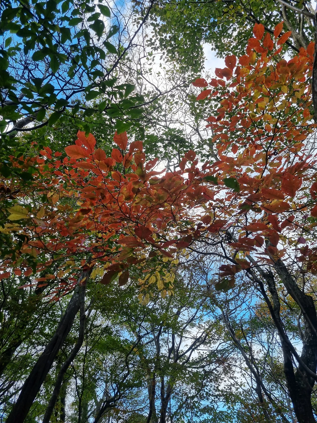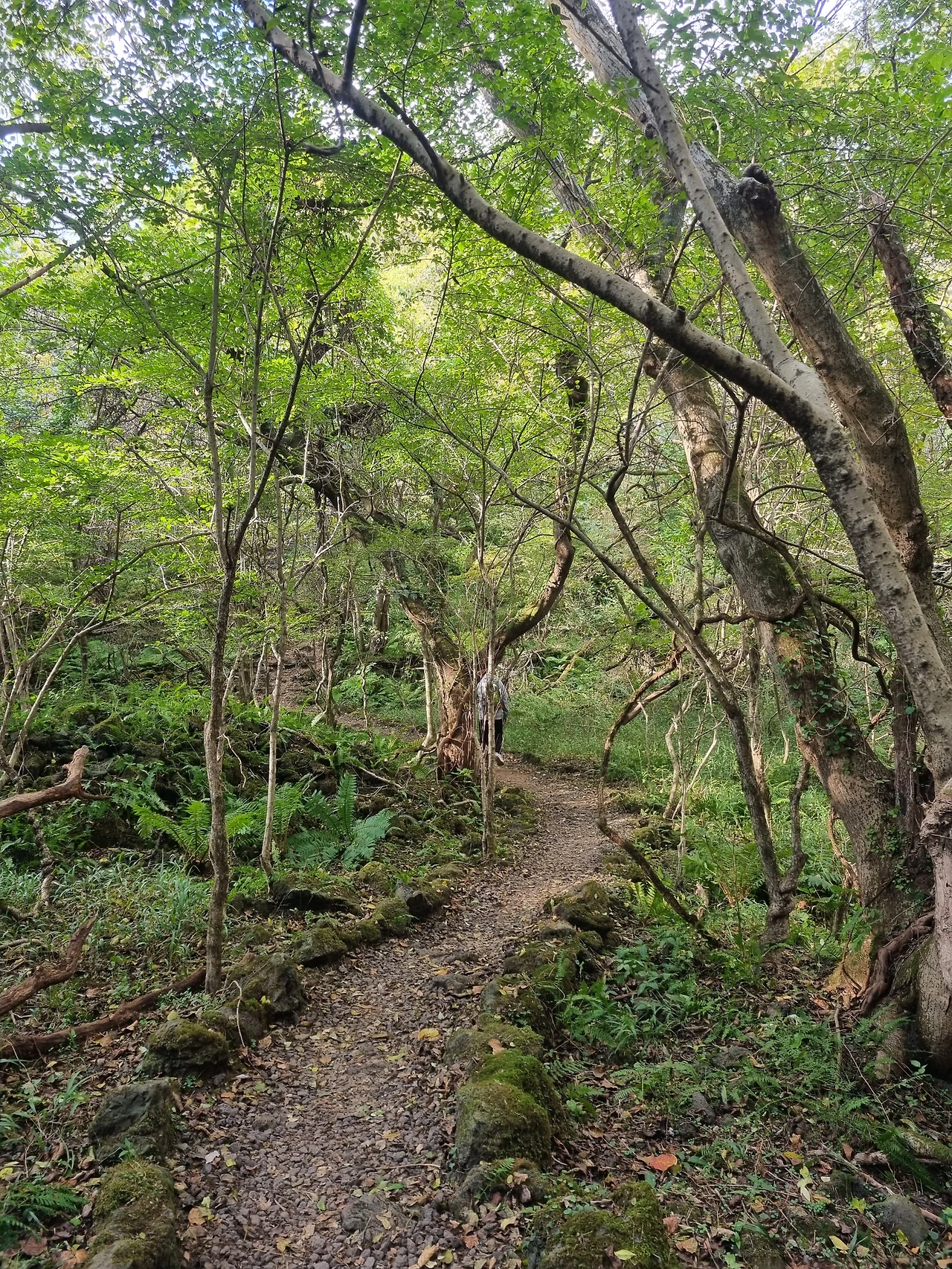 늦은 오후에 차가워진 공기가 훅 코로 들어와 옷을 여미고 곶자왈이기에 울퉁불퉁한 좁은 길을 따라 친구가 앞서고 나는 뒤를 따라 걸었다. 제법 걸은 것 같은데 겨우 800m가 지났다는 안내문이 보였다. '이 속도로는 무리일 것 같은데?' 호기롭던 내 마음도 조급해진다. 마음이 급하니 발걸음도 바쁘고 눈은 곶자왈을 느낄 틈도 없이 울퉁불퉁한 계단 돌길에서 넘어지지는 않을지 염려되어 땅만 내려다보게 됐다. 가는 길에 들꽃도 찍고 계절을 온몸으로 즐기는 나무들도 찍으며 호흡도 깊게 들이마셔보고 나무들 사이로 보이는 하늘을 찍어보는 나였는데 오름에 빨리 올라갔다 와야 한다라는 생각이 그간 즐기던 것들을 가로막아 버렸다. 오로지 들리는 것은 친구와 나의 발자국 소리, 슝슝 바람소리와 가끔 숲에서 들리는 바스락 거리는 소리뿐이었다. 그런 생각이 들자 일부러 하늘을 쳐다봤다. 어느새 단풍이 한창 들기 시작한 나무도 보이고 곶자왈 특유의 거친 길과 떨어진 가을 낙엽과 덩굴식물, 나무들이 보였다.