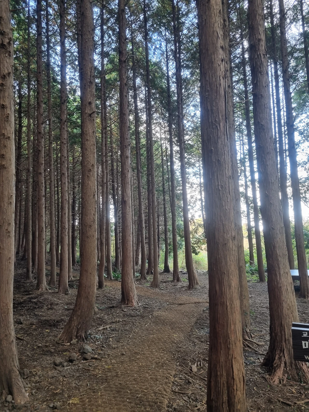 얼마나 갔을까 갑자기 어두워지더니 풍경이 달라지며 빽빽한 편백나무 숲이 나왔다. 곶자왈 숲길의 구불구불하고 하늘이 막힌 길을 걷다가 하늘로 곧게 쭉쭉 뻗은 편백나무들을 보니 다른 세계에 들어온 듯했다. 뭔가 신령한 기운이 나를 감싸고 있는 착각이 들더니 갑자기 힘이 나며 발걸음이 가벼워져 친구와 벌어진 거리를 가볍게 뛰어 쫓아가 본다. 이상하게도 자꾸만 뒤돌아보게 만드는 편백나무 숲길이 었다. 숲 입구에 나무 평상이 몇 개 놓여 있었는데 다음에는 꼭 와서 이 숲의 기운을 듬뿍 받아가리라 혼자서 약속을 하고 길을 재촉했다.