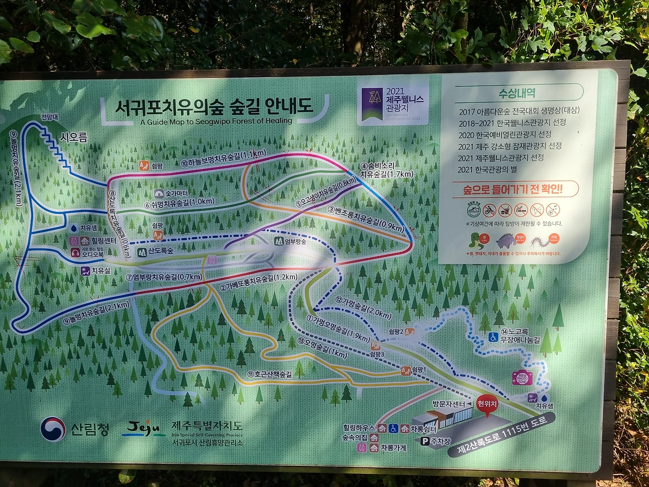 몇 주 전 서귀포에 있는 치유의 숲을 다녀왔다. 몇 해전부터 한 번은 가보고 싶다 하면서도 사전 예약을 하고 가는 곳이었던 지라 게으름에 이제야 처음으로 가봤다. 숲으로 들어서니 다양한 길들이 많다. 안내도를 바라보며 어디로 갈지를 고민하던 우리는 숲길을 따라 걷다 오름도 갈 수 있다고 해서 일단 오름 쪽으로 향하는 길을 따라 걸었다.