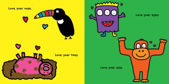 문장도 쉽다. 의 책에는 love your face. love your space. love your nose. love your toes. love your eyes. love your size. Love your walk. Love your talk. LOVE YOURSELF. LOVE THE WOLRD! LOVE YOURSELF. LOVE THE WORLD! LOVE YOURSELF. LOVE THE WORLD!