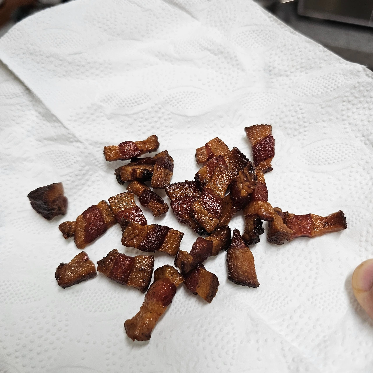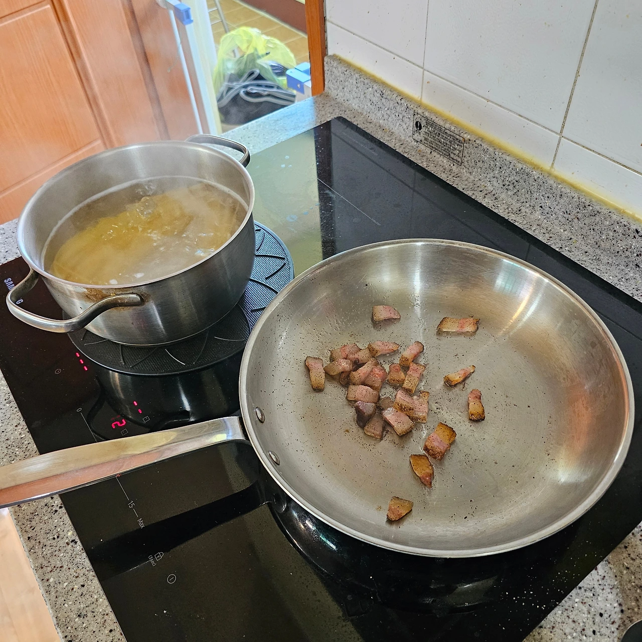 관찰레는 지방 함량이 매우 높고, 바로 이 지방이 파스타 풍미의 핵심을 좌우합니다. 따라서 단순히 익히는 것이 아니라 최대한의 지방을 빼내는 작업이 필요합니다.