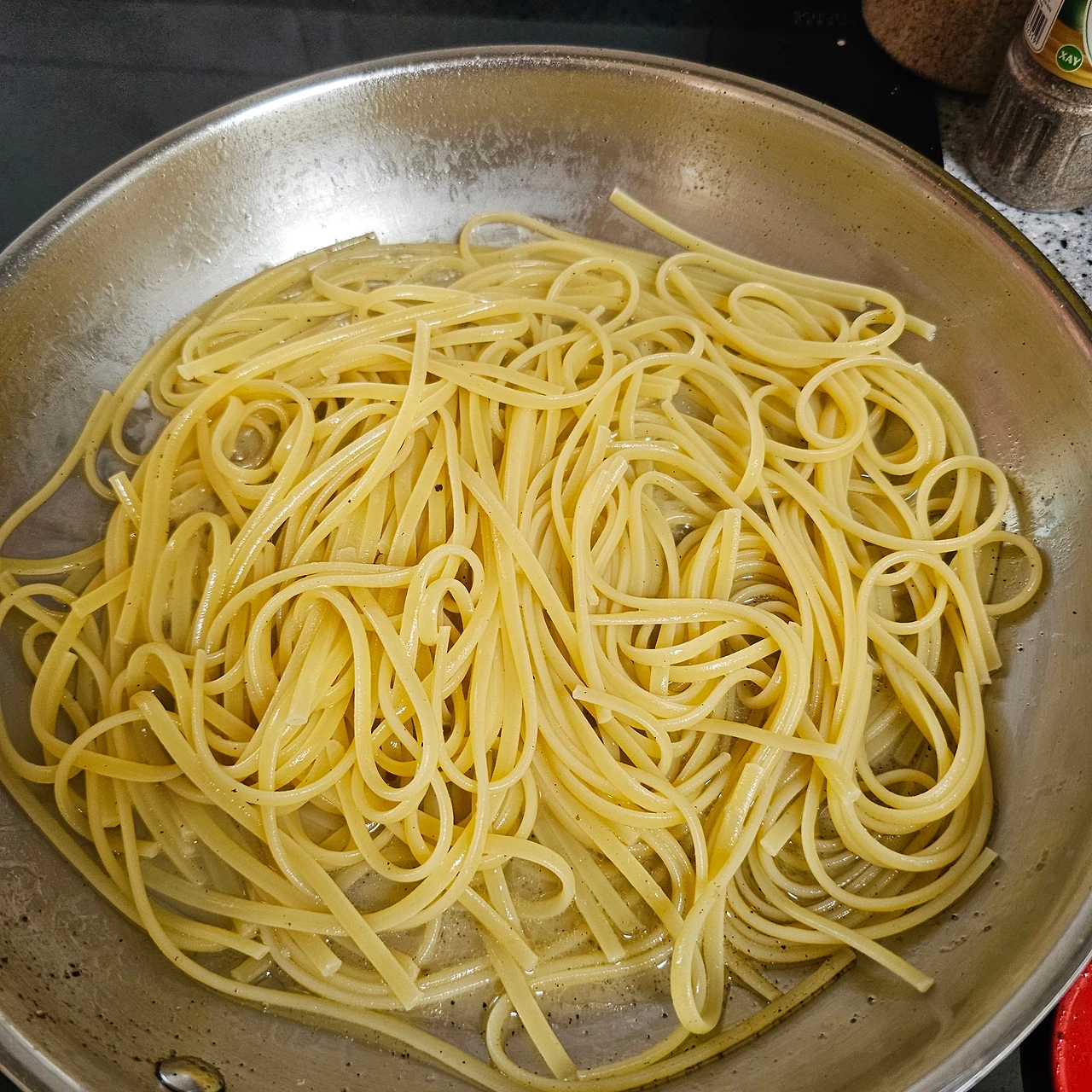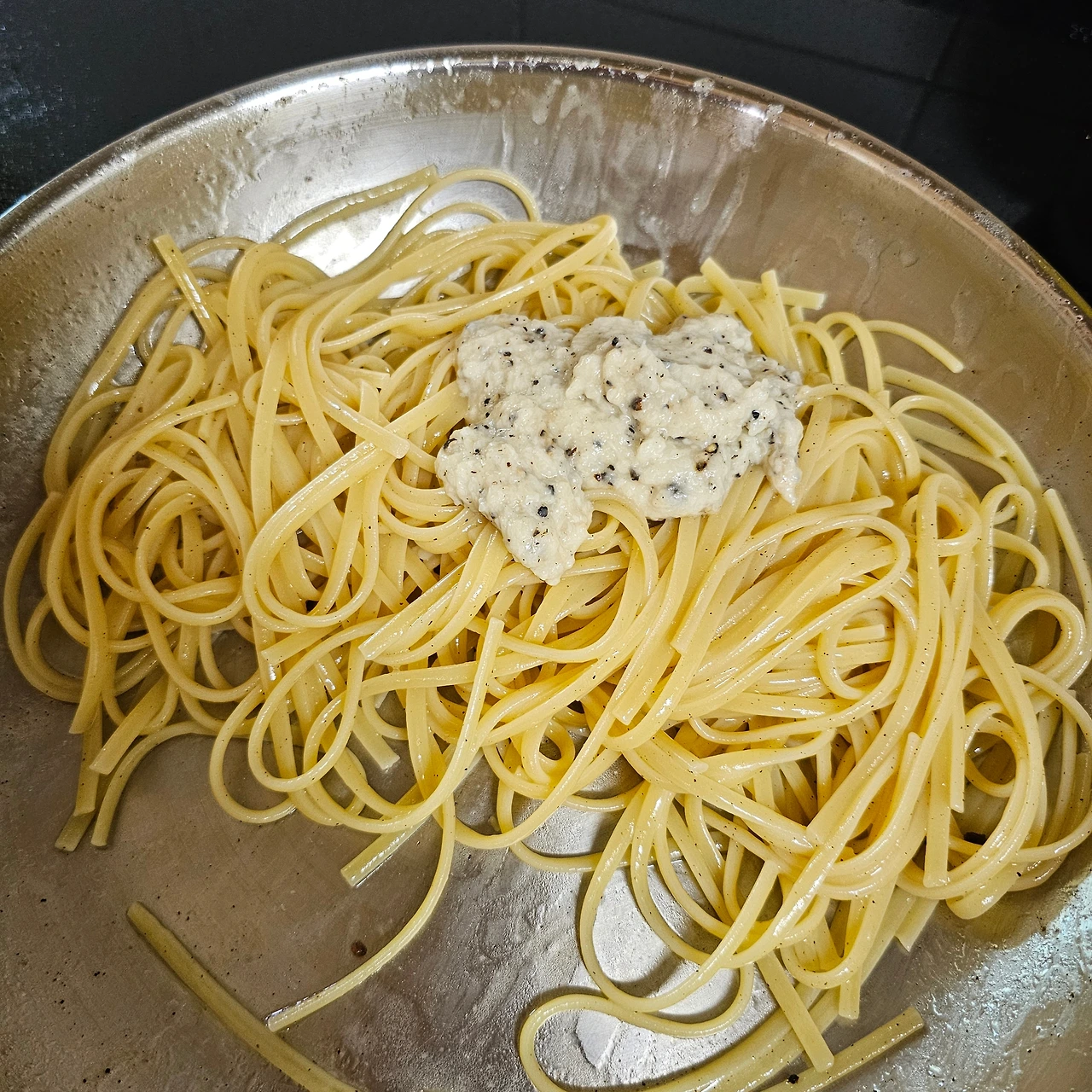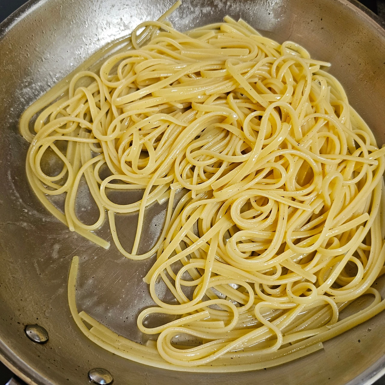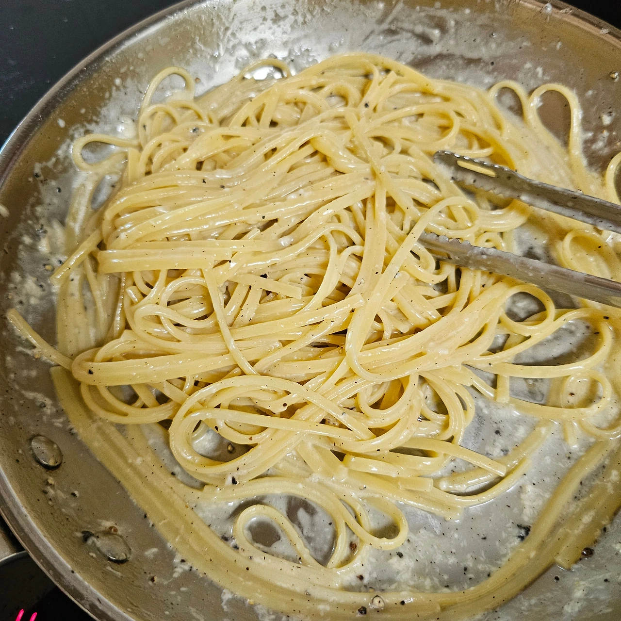 이 과정에서 후추의 깊은 향과 매운 기운이 활성화되며, 나중에 파스타 전체에 은은하게 퍼지는 풍미를 만들어 줍니다.