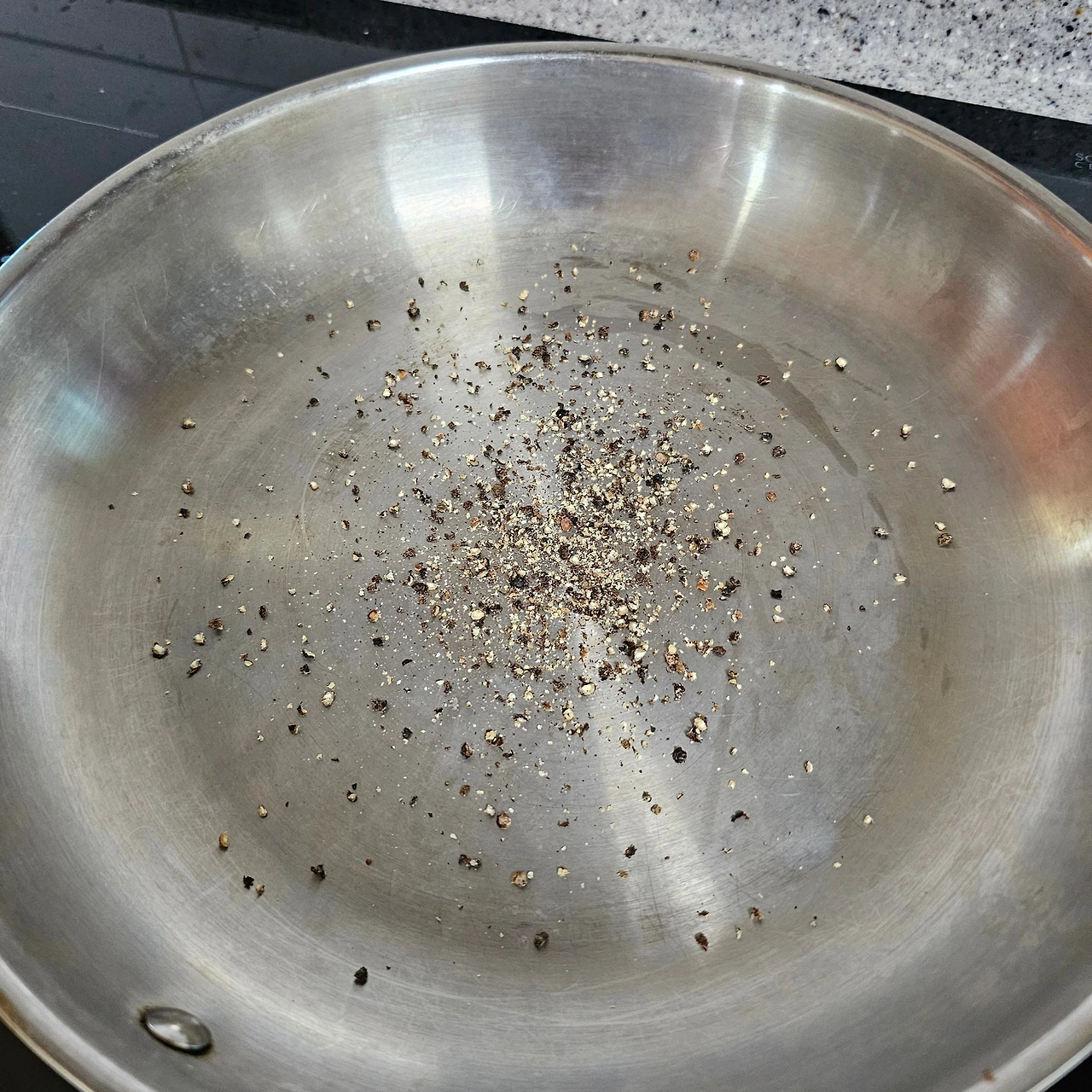 굵게 빻은 후추를 팬에 넣고 은은하게 가열해 주세요.
