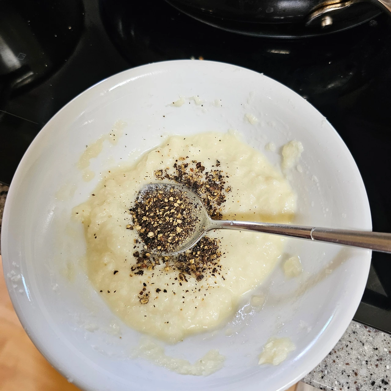 만약 적절한 점도의 치즈 페이스트가 완성되었다면, 이전 단계에서 가열해 둔 후추를 이 페이스트와 섞어 주세요.