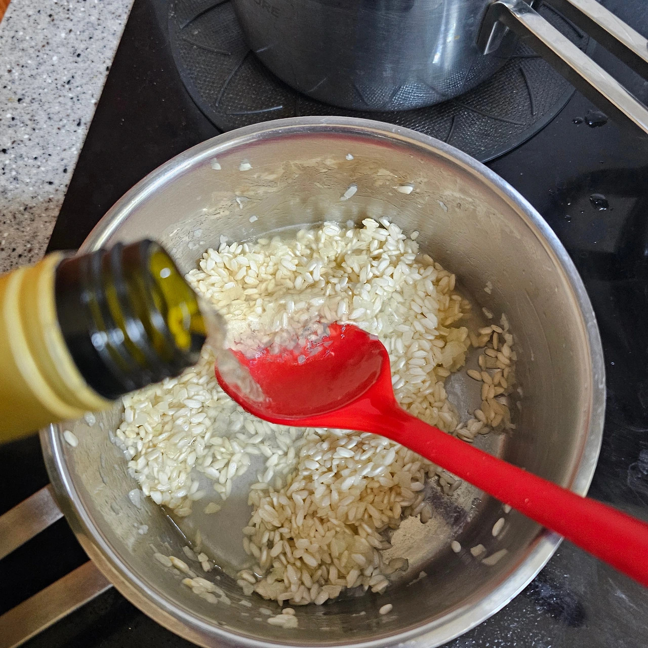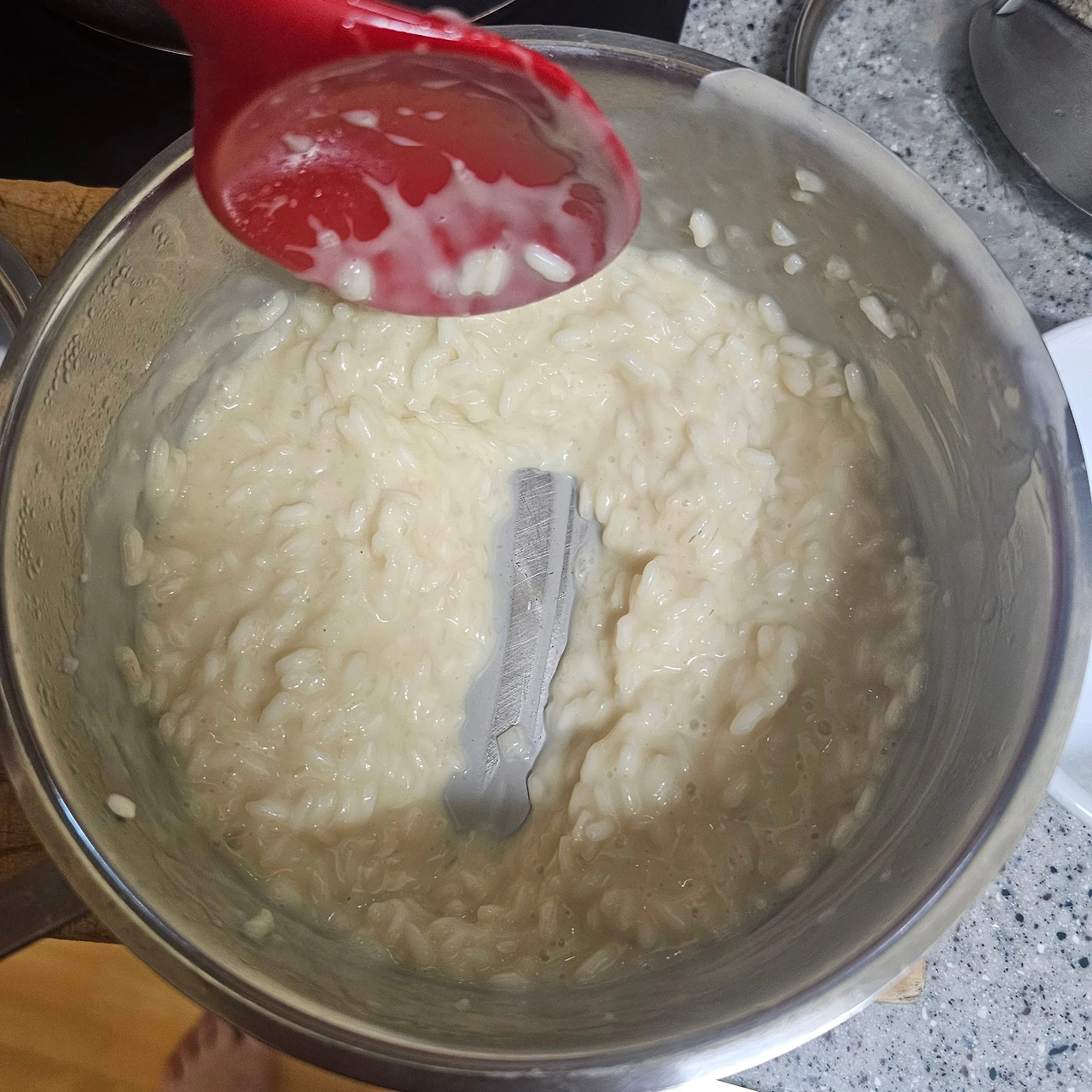 쌀이 익어가며 육수를 머금기 시작하면 점점 더 매끈한 질감이 만들어집니다. 그리고 알덴테 직전, 쌀의 중심에 아주 약한 탄력이 남아 있을 때,ㅠ그때는 살짝 더 힘을 주어 저어줍니다. 이 시점에서 전분이 잘 풀리며, 리조토 특유의 ‘크레마(cream-like texture)’가 완성됩니다.
