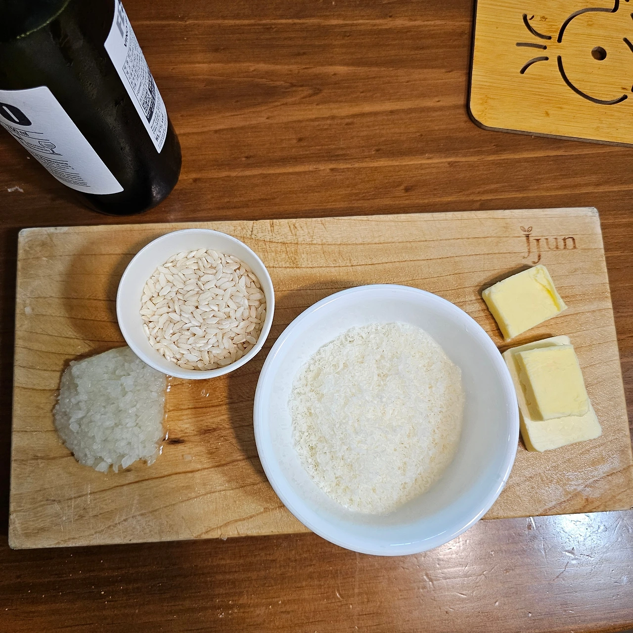 파르미지아오 치즈고 미리 갈아주고 다른 재료들도 미리 계량해 준비해 둡니다. 리조토는 타이밍의 요리이기 때문에 조리 중에 재료를 찾기 시작하면 온도가 흐트러지고, 리듬이 깨지기 쉽습니다. 육수도 미리 끓여놓습니다.