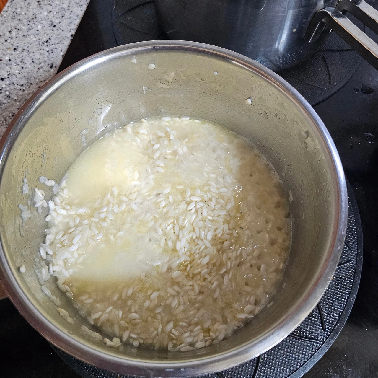 양파의 향이 충분히 올라오면, 준비해 둔 리조토용 쌀을 넣고 천천히 볶아줍니다.