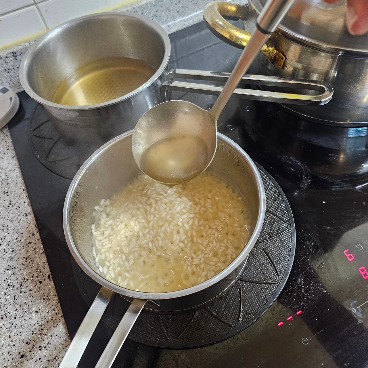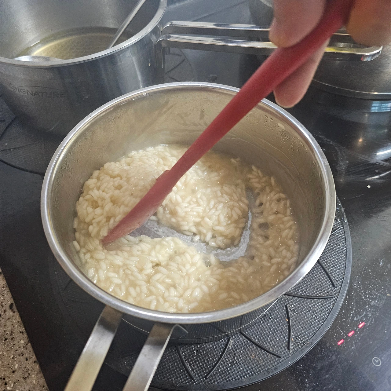 쌀알의 표면 전분과 내부 수분이 균형을 이루게 됩니다. 이 과정을 거쳐야 이후 만테까레 단계에서 지방과 전분이 완벽히 유화되어 ‘부드러움 속의 탄력’을 갖게 됩니다.