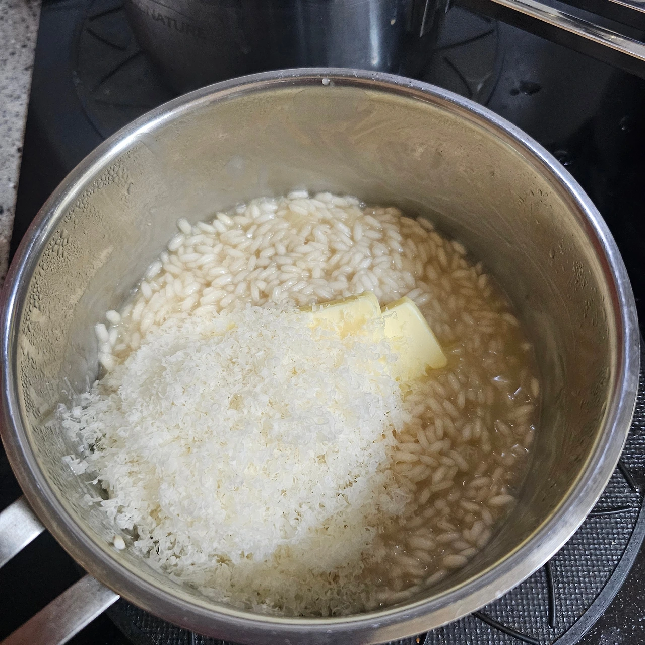 이제 만테까레 직전, 리조토를 잠시 쉬게 할 시간입니다. 불을 완전히 끄고, 준비한 버터와 치즈를 넣습니다. 하지만 아직 섞지 마세요.