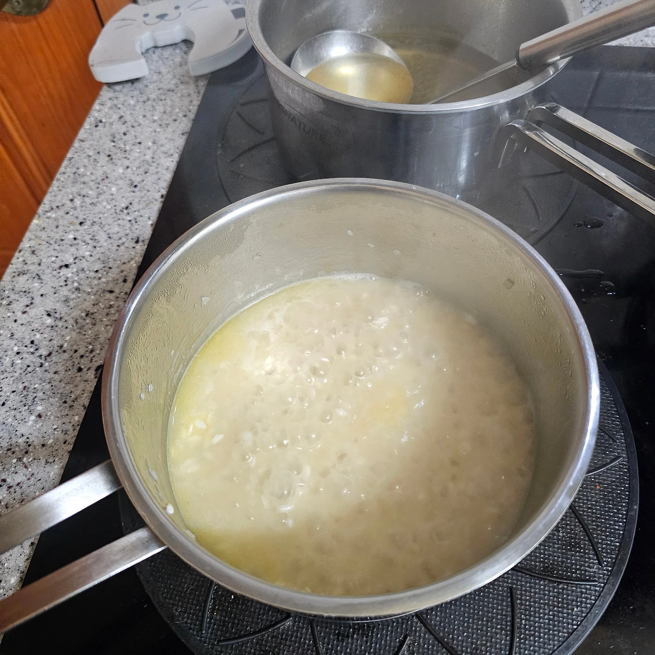 국자 한두 국자씩 부어가며 천천히 저어줍니다.