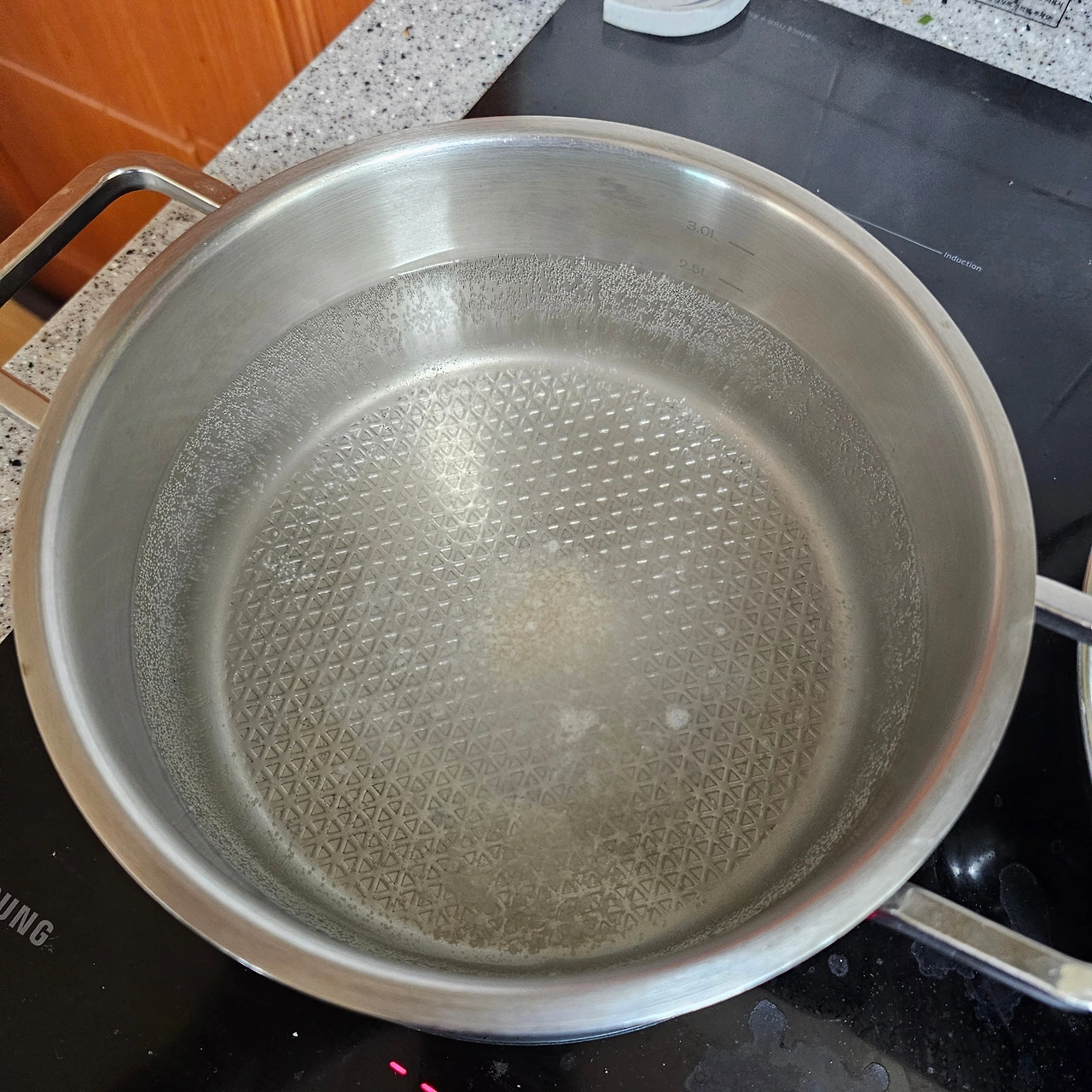 정말 조금, 팬 바닥이 살짝 적실 정도면 충분합니다.