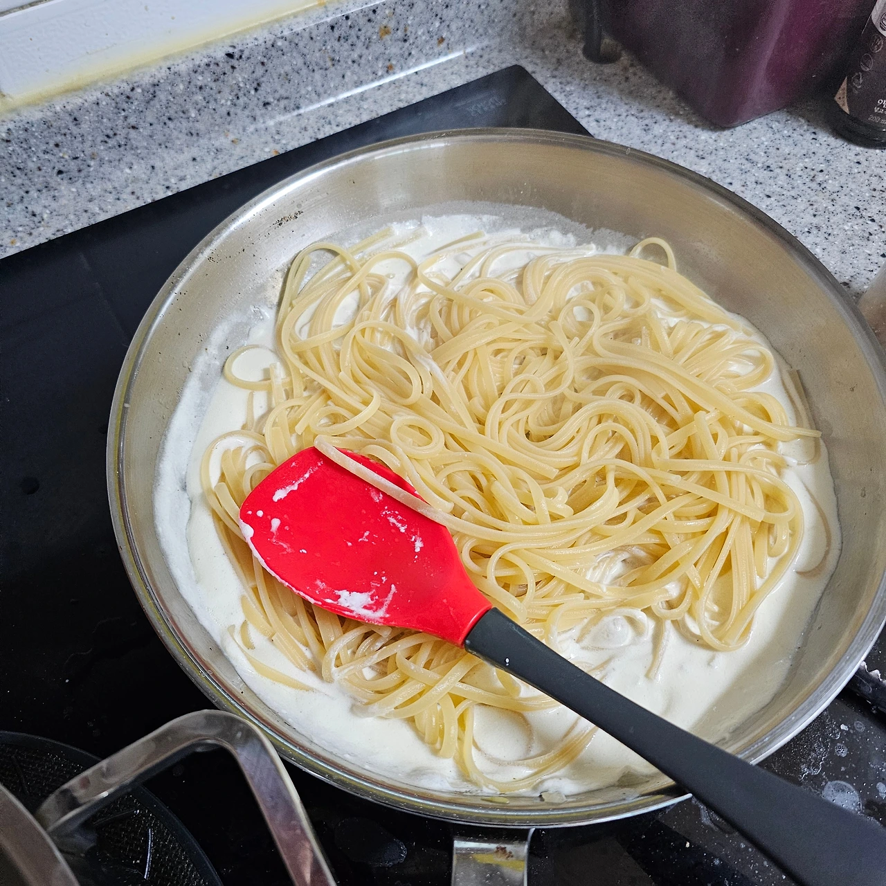 면은 물에서 거의 다 익힌 뒤, 소스에는 최소한의 시간만 머물게 하기 마스카포네 파스타는 라이트하고 우아한 질감이 매력인데, 이 원칙을 지키면 그 질감이 정확히 살아납니다.