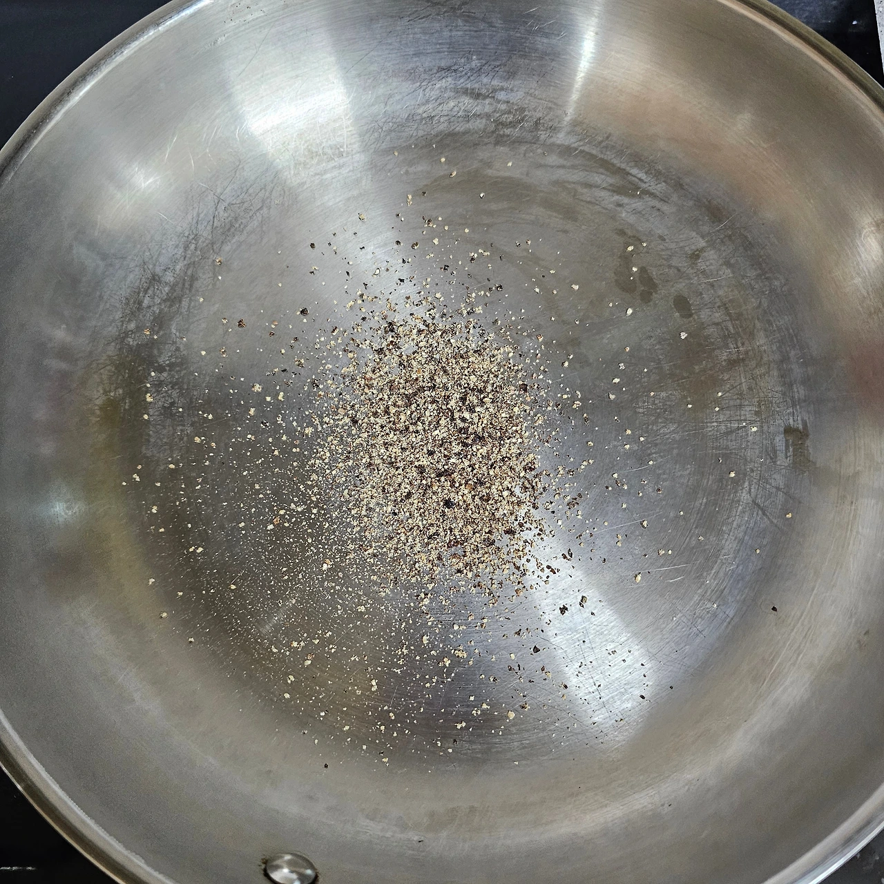 이렇게 미리 볶은 후추를 치즈와 함께 준비해두면, 나중에 소스를 만들 때 치즈의 고소함과 후추의 알싸한 향이 자연스럽게 섞이며 매우 조화로운 베이스가 됩니다.