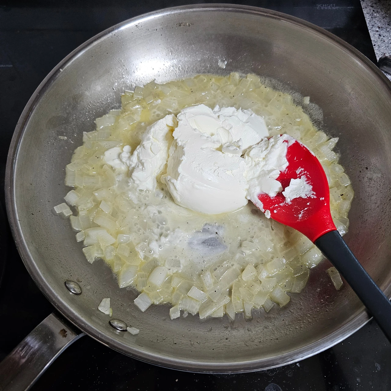 치즈가 녹아들기 시작하면 양파와 버터, 와인의 잔향이 마스카포네와 하나로 섞이며 부드럽고 은은한 아이보리색 소스가 만들어집니다.