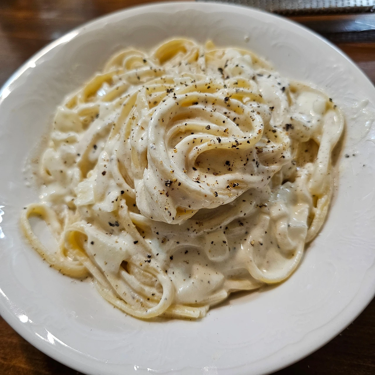 이 파스타에서 중요한 축은 마스카포네의 부드러움과 치즈의 깊이, 그리고 그 둘 사이를 단단히 묶어주는 후추의 향입니다.