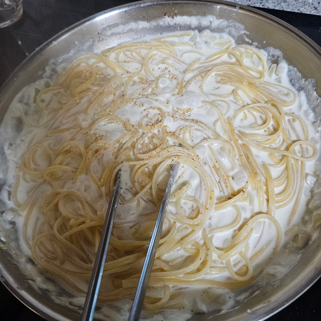 방금까지 따뜻했던 팬의 잔열만으로 치즈가 천천히 녹아 들어 소스가 한층 더 깊고 촘촘하게 변해요. 이때 주걱으로 천천히 섞어주면 소스가 면에 더욱 밀착되고 버터, 마스카포네, 파르미지아노, 페코리노가 하나의 결로 정리되면서 ‘딱 맞는 농도’가 잡힙니다.