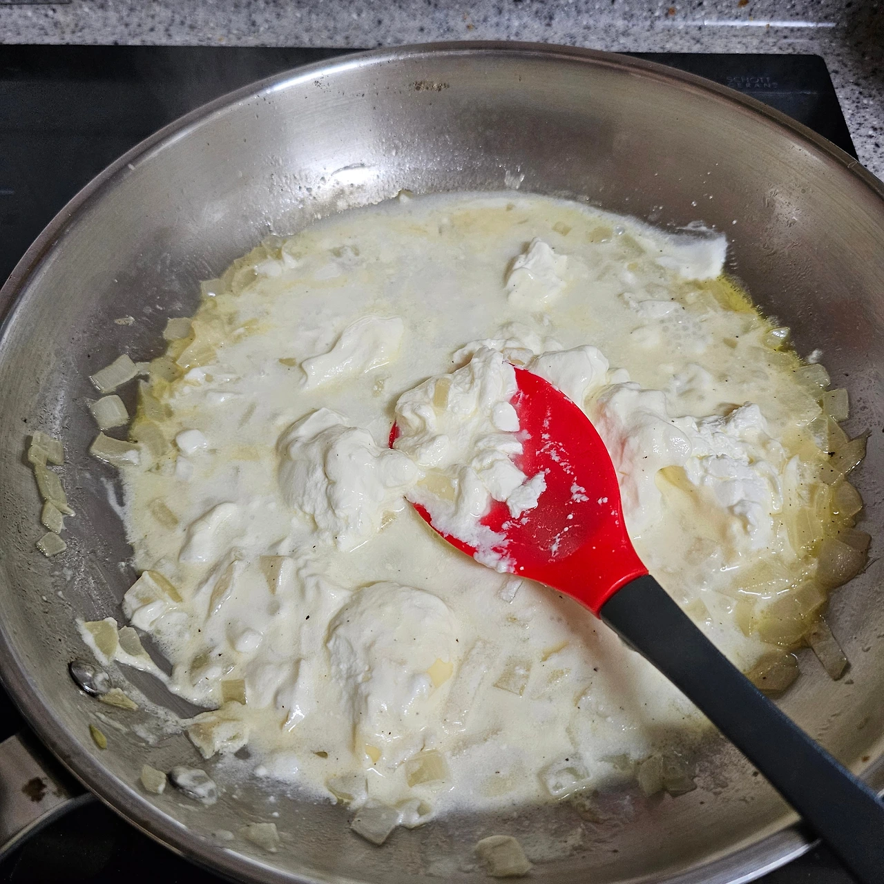 스푼으로 떠 넣는 순간, 치즈가 부드러운 생크림처럼 팬 위에서 가볍게 퍼집니다. 마스카포네 특유의 묵직하지만 우아한 향이 버터와 양파 사이에서 천천히 피어오르죠.