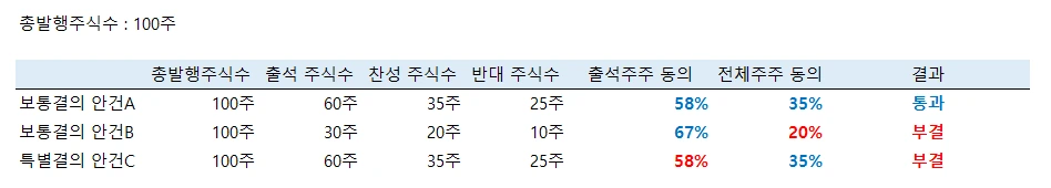 보통결의가 필요한 안건A는 출석주주 동의 과반 이상, 전체주주 동의 1/4 이상 요건을 만족해서 통과되었지만, 안건B는 전체주주 동의가 25%에 미달해서 부결되었네요. 특별결의가 필요한 안건C는 안건A와 똑같은 상황인데요, 전체주주의 동의는 1/3 이상의 찬성을 받았지만 출석주주 2/3의 찬성은 얻지 못해서 부결되고 말았어요. 여기서 한 가지 참고로 말씀드리면 회사가 혹시 자기주식을 보유하고 있다면 그 주식은 총발행주식수 계산에서 제외해야 합니다. 총발행주식수가 110주인데 이중에서 10주가 자기주식이라면 100주로 계산한다는 의미입니다.