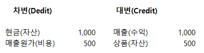 그럼 전표를 기록하는 예시 몇 가지를 보겠습니다. 농장주인에게 500원을 주고 사 와서 재고로 보관하고 있던 사과 1개를 손님에게 팔고 1000원을 받았습니다. 여기서 두 가지 경제적 사건이 동시 발생합니다. 500원어치의 상품 재고가 팔리면서 매출원가가 된 것이고, 손님에게 1000원을 받고 팔아서 그만큼 현금이 늘어난 겁니다. 이걸 전표로 기록해보면 아래와 같아요.