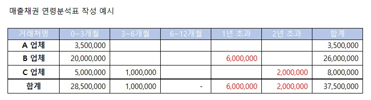 결과적으로 매출과 동일한 금액이 비용으로 남게 되는 셈입니다. 영업이익 0원인 헛장사를 한 것이죠. 그래서 평소 주기적인 매출채권 관리는 무척 중요하다! 다시 한번 강조드리고요, 아래 표처럼 매출채권 연령분석표를 만들어서 계속 업데이트하며 관리하는 것도 도움이 됩니다. 대금 회수가 안 되는 '악성 잔고'의 기준을 얼마부터로 볼 것이냐는 회사의 업종에 따라 다를 수 있겠지만, 3개월이 넘어가면 문제가 있는 것으로 보고 1년이 넘어가면 대손충당금 설정 이슈가 생기는 게 일반적인 것 같습니다. 물론 그렇게 되는 상황은 가능한 없어야겠지요.