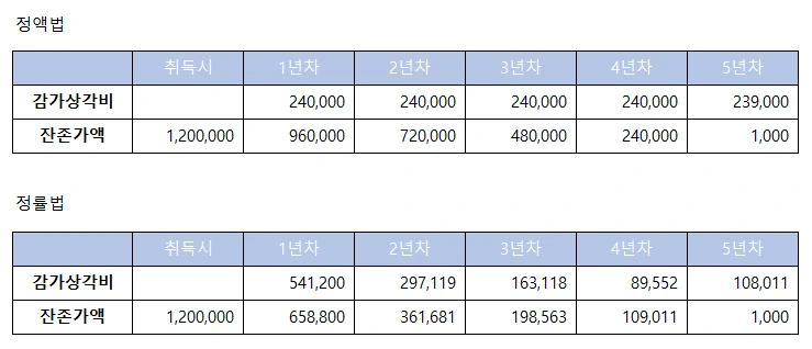 그럼 실무적으로 감가상각비를 구하는 계산을 간단히 해볼게요. 우선 정액법은 매우 간단합니다. 120만 원짜리 자산인데 내용연수가 5년이라면 120만 원에서 5년을 나눠준 24만 원을 매년 상각해 주면 끝입니다. 같은 자산을 정률법으로 계산을 하면 우선 자산 취득 후 1년 차의 감가상각비는 120만 원 × 0.451 = 541,200원이 됩니다. 그 금액을 120만 원에서 차감해주면 658,800원이 되는데 이게 잔존가액이죠. 2년 차에 여기서 다시 0.451을 곱해서 2년 차 감가상각비를 구해주는 식입니다. 간단히 표로 보여드릴게요.