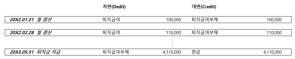 평균임금은 각종 수당 발생 혹은 연봉 변동 여부에 따라 매월 변경될 수 있으니, 매월 인식하는 비용도 조금씩 달라질 수 있겠죠? 그리고 마지막 퇴직금 지급일을 기준으로 정확히 퇴직급여부채도 확정되면서, 그것을 반제하고 지급 처리해 줍니다. 여기서 포인트는 매월 일정한 비용과 부채를 함께 인식하다가, 퇴직금 지급 시점에 별도로 인식하는 비용 없이 쌓아놨던 부채를 반제하며 지급해야 한다는 것이에요. 물론 예외적인 경우도 있는데요, 퇴직위로금을 추가로 지급하는 경우입니다. 이때는 일시에 비용을 인식하면서 지급처리를 해줍니다.