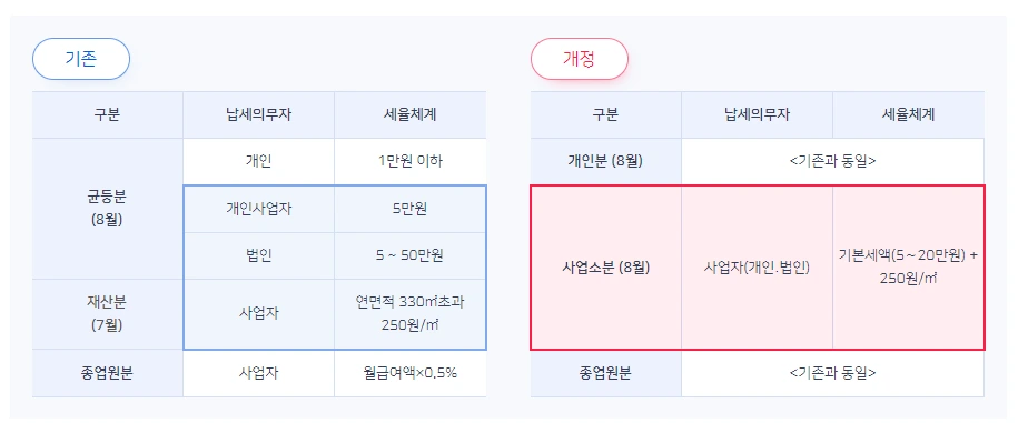 먼저 주민세 사업소분이 있습니다. 2020년까지는 7월에 내는 주민세 재산분과 8월에 내는 주민세 균등분이 있었는데요, 이것이 2021년부터 8월에 통합해서 납부하는 주민세 사업소분으로 개편되었습니다. 이 세금은 자본금(또는 출자금)의 규모와 사업장 면적에 따라 냅니다. 법인은 무조건 내야 하는 세금인데, 우선 자본금 규모에 따라 5~20만 원까지 납부해요.(자본금 30억 원 이하 : 5만 원, 30억 원 초과 50억 이하 : 10만 원, 50억 원 초과 : 20만 원) 그리고 사업장 연면적이 330㎡ 이상인 경우, 1㎡당 250원의 추가 세액이 발생합니다. 이 세금은 8월 말일까지 자진 납부해야 합니다. 다행히 기존에 균등분을 내던 사업주에게는 고지서가 날아오지만, 그 이후에 사업자등록을 했다면 별도 고지가 없을 수 있으니, 누락했다가 가산세가가 발생하지 않도록 주의를 요합니다.