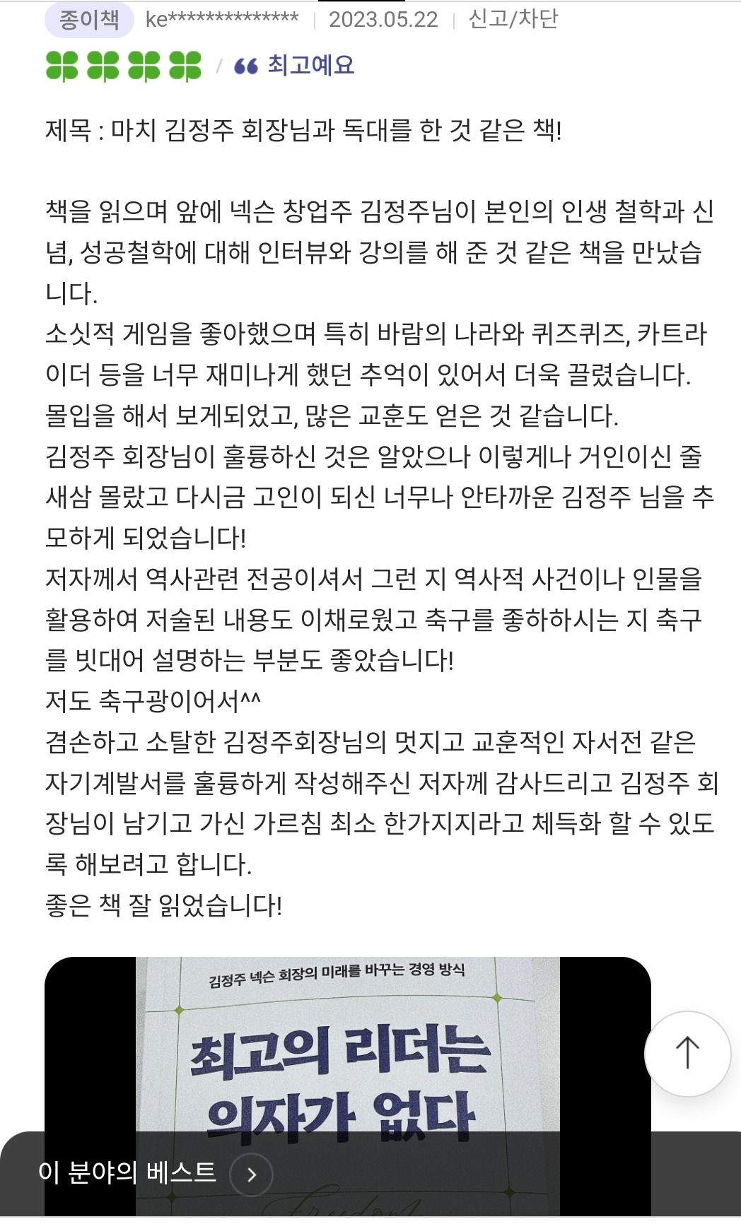 비즈니스하시는 분이라면, 조직을 이끄는 분이라면, 리더십을 발휘할 필요가 있으신 분이라면, 의미있는 인생을 살고 싶으신 분이라면 꼭 한번 읽어보시길 추천드립니다. 우리 동시대에 큰 족적을 남긴 거인, 김정주의 삶을 기억하고 배울 거리를 하나씩 얻어가 보시길 진심으로 바랍니다.