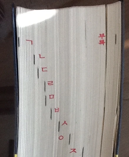 내 짝은 능수능란하게 필요한 단어를 척척 찾았다. 그러나 나는 버벅거리는데다가 사전에 없는 어휘도 많았기에 번번이 짝궁의 사전을 빌렸다. 하루는 이 친구가, 약간 답답하다는 듯한 손짓을 했다. 그러고는 내 사전을 건네달라고 했다. 받아들고서 이리저리 살펴보던 그 애는 대뜸 "글자가 없네. 이러니 못 찾지!"라고 말했다. 글자가 없다니 그게 무슨 소리인가 싶어서 멀뚱히 바라봤더니, 책 오른편을 가리켰다. 아닌 게 아니라, 다른 사전들은 그 부분에 ㄱㄴㄷ~ㅎ의 '색인'이 새겨져 있었으나 내 것은 그렇지 않았다.