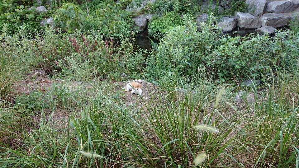 개천가 풀숲에 웅크리고 앉아서