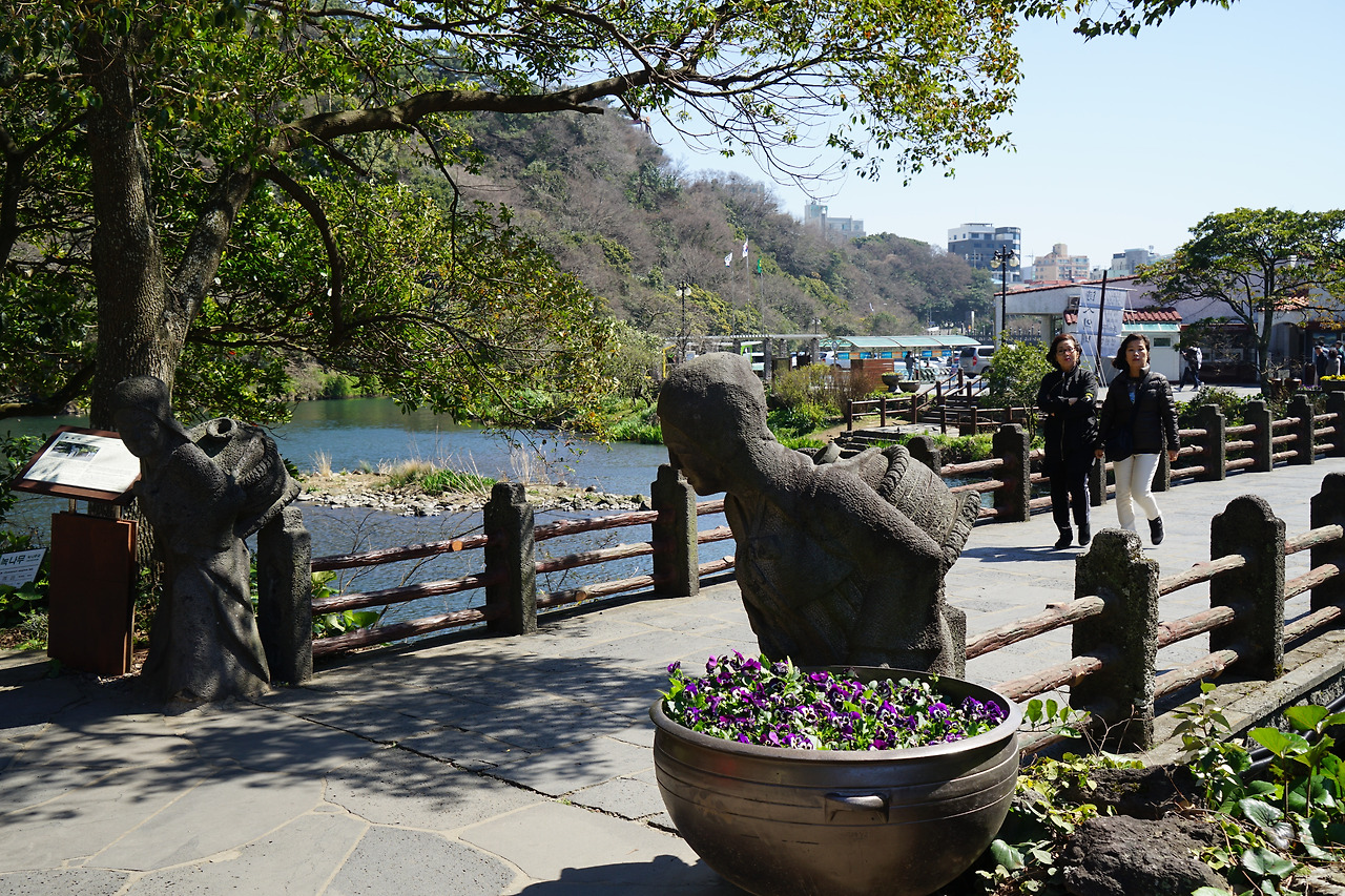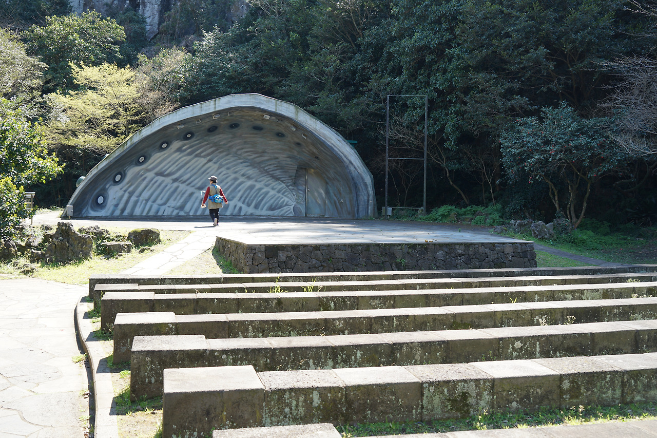 좀 더 들어가자 천지연 물이 흐르는 개울을 건너는 아주 특이한 징검다리가 있어 건너가니 커다란 소라 모형의 무대와 객석의 의자가 배치된 공연장이 인상적이었으며 그 앞에는 용 두 마리가 여의주를 사이에 두고 있는 조형물이 있었다