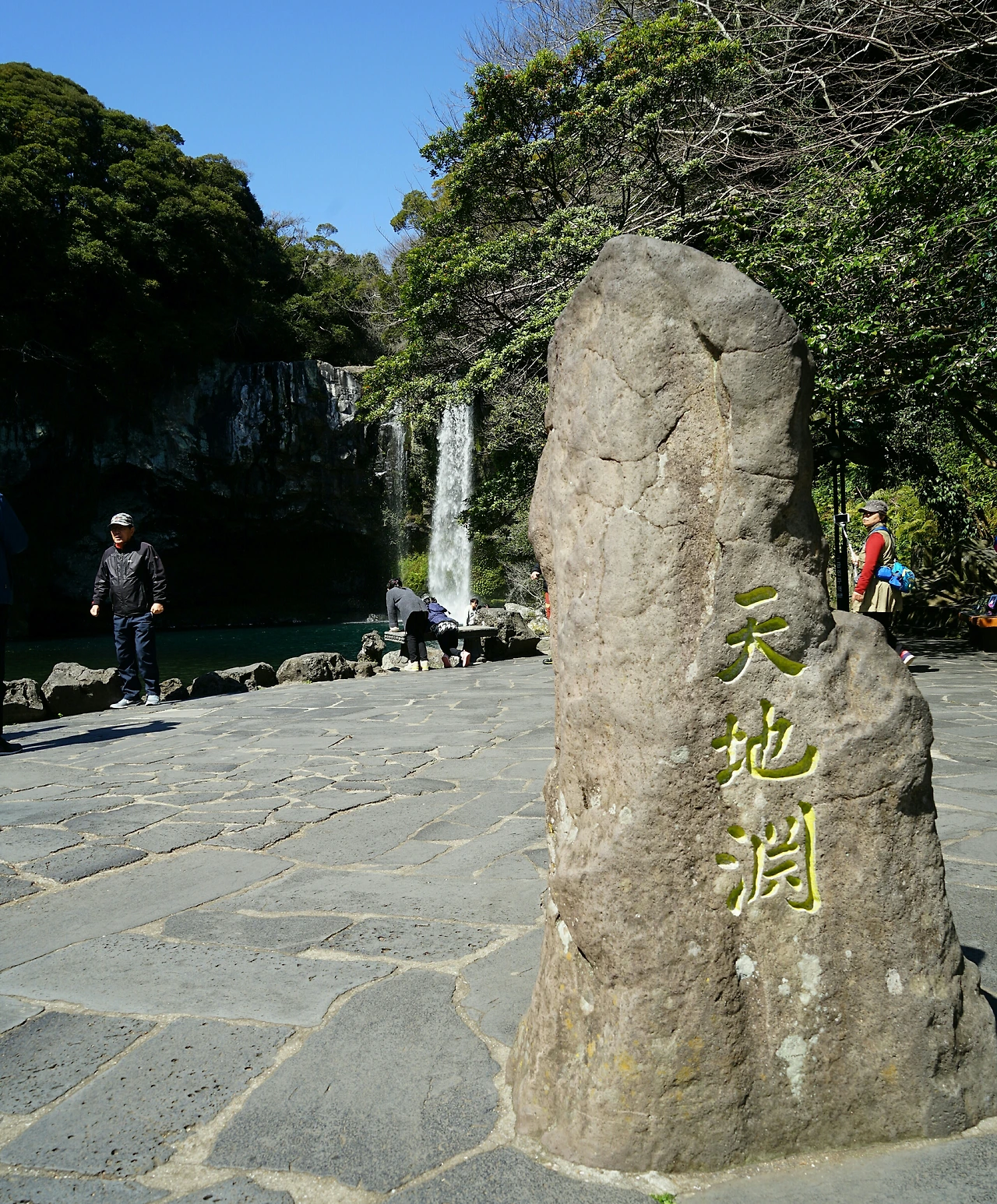 다시 다리를 건너 가자 오랜 세월 천지연 입구를 지켰음을 자랑하는 세월 먹은 소나무들과 또 다른 나무들이 터널을 이루며 여행객을 반기는 풍경에 감탄하며 통과하자 천지연 명패석과 천지연이 나타났다