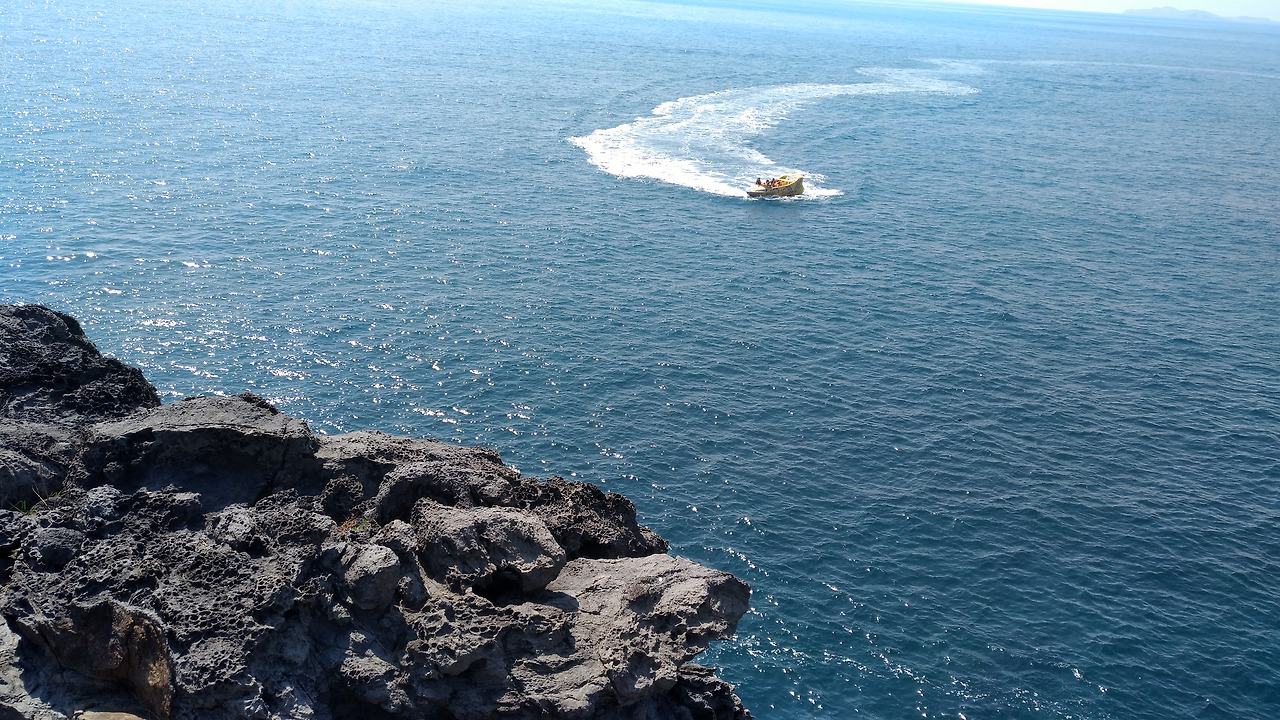 입구의 아기 돌고래 모형들이 관광객을 반기고 수 않은 사람들에 밀려 주상절리를 볼 수 있는 나무다리로 연결해 놓은 계단으로 따라 들어가 바다를 내려다보니 맑고 푸른 바다에 부딪치는 하얀 파도 관광객을 태운 배들이 가까이에 있고 하늘은 너무도 맑고 푸르렀다