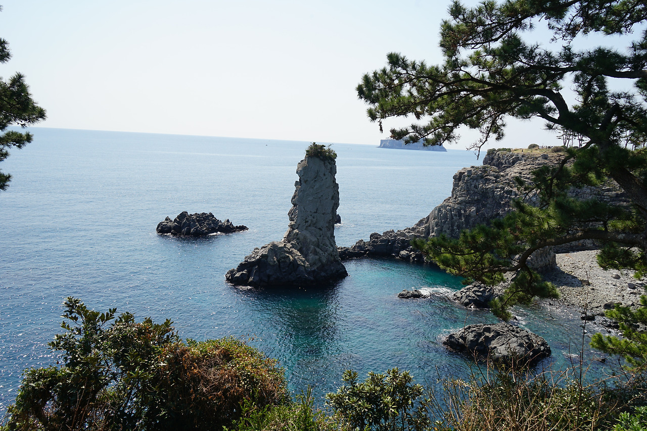 외돌개를 보는 각도에 따라 달라지는 풍경을 보기 위해 걷는 길 코스를 따라가니 멋짐을 자랑하는 해안 바위와 바다에 떠가는 배들이 보이고 대장금을 촬영했던 장소라는 입간판과 대장금 모형에 얼굴을 넣고 사진을 찍을 수 있었으며 외돌개의 모습은 또 다른 풍경으로 다가왔다