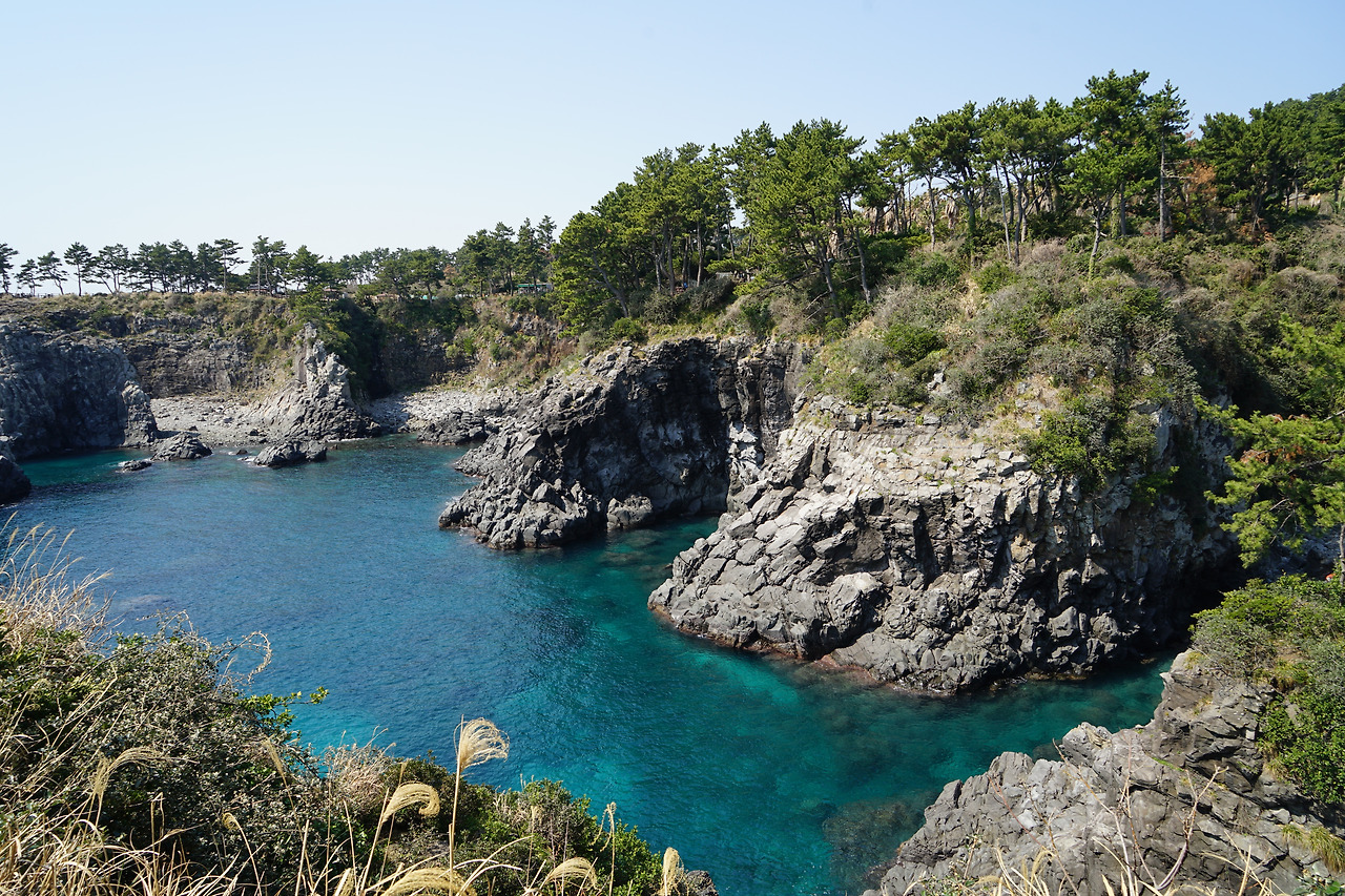 잠시 휴식을 취하고 반대 방향으로 발길을 돌렸는데 유채 꽃길을 지나 조금 더 가자 넓은 반석이 쫙 펼쳐진 제주 해안에서 보기 힘든 해변이 나타났는데 그곳에서 보이는 해안선의 풍경은 정말 그림 같았다