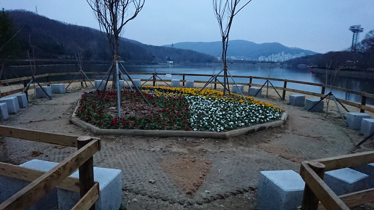 새벽 공기를 마시며 호수를 한 바퀴 도는데 호숫가 도로가 깨끗이 정비되어 있었고 호수 속에 밀려온 흙을 쌓아 만들어진 작은 동산은 그 입구를 개방하고 양쪽 길가를 꽃 화분으로 꾸며 입구를 장식해놓았다